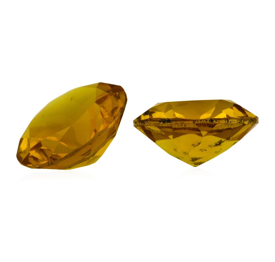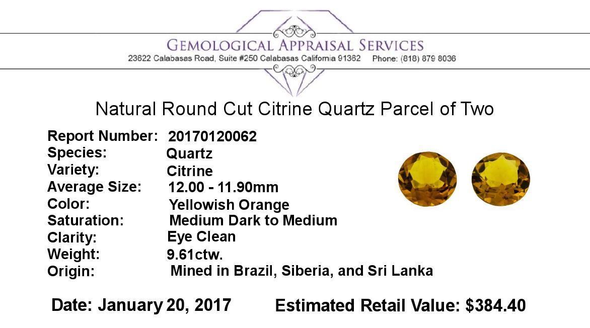 One natural round cut citrine quartz parcel of two with an exact weight of 9.61ctw., clarity is eye clean, yellowish orange, medium dark to medium. Gemological Appraisals Services estimates the retail value at $384.4 GAS Appraised.