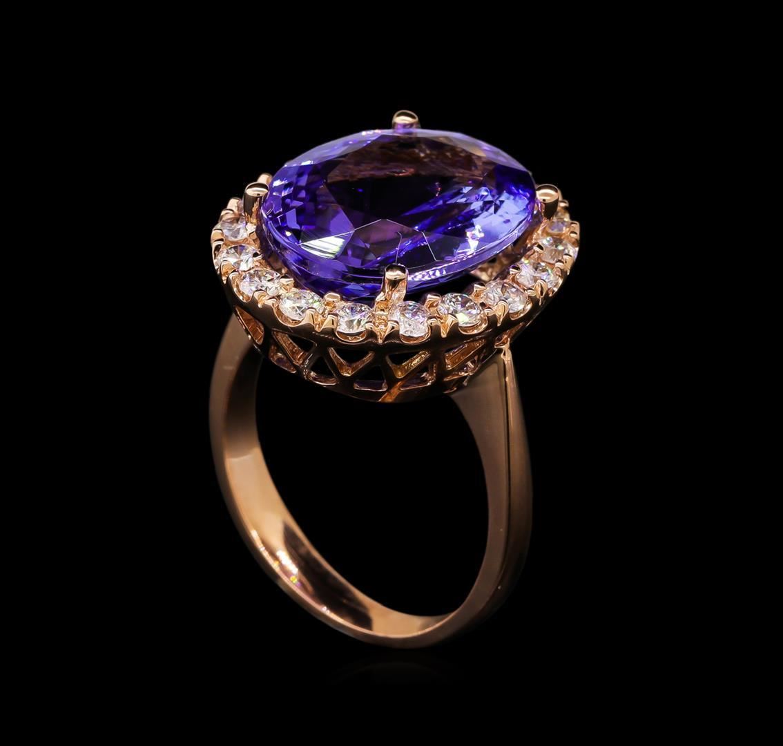 One electronically tested 14KT rose gold lady's cast fashion ring with a basket halo with a bright polish finish. The featured lady's ring has a shank measuring 2.92 millimeters wide. Identified with markings of 'K14'. Condition is new, good workmanship. Containing: One prong set oval modified brilliant cut natural tanzanite, measuring 15.24 x 12.18 x 6.56mm, (depth est.) 12%. bulge factor, approximate weight of 9.61ct., clarity is eye clean, medium light, very slightly grayish, violet color, (GIA V 4/3), cut is very good. Transmitting light with no distortion, transparent. Colored gemstones are presumed to have been subjected to commonly used enhancement processes. Graded in the setting. Eighteen prong set round brilliant cut diamonds, measuring 2.40 - 2.30 x 1.46mm (depth est.) approximate total weight of 18 Stones = 0.90ct. Graded in the setting. Clarity SI-1 to I-1. Color: H - I Cut Good. Total Weight of Colored Stones 9.61ct.. Total Weight of Diamonds 0.90ct.. Total Weight of Ring 7.50gm GAS Appraised.