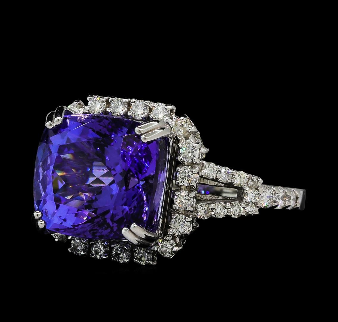 One electronically tested 14KT white gold lady's cast fashion ring with a cathedral shank with a basket halo with a bright polish finish. The featured lady's ring has a shank measuring 1.88 millimeters wide. Identified with markings of 'K14'. Condition is new, good workmanship. Containing: One prong set rectangular cushion modified brilliant cut natural tanzanite, measuring 10.74 x 11.80 x 9.38mm, (depth est.) 3%. bulge factor, approximate weight of 9.62ct., clarity is eye clean, medium dark, strong, bluish violet color, (GIA bV 6/5), cut is very good. Transmitting light with no distortion, transparent. Colored gemstones are presumed to have been subjected to commonly used enhancement processes. Graded in the setting. Six prong set round brilliant cut diamonds, measuring 2.00 - 1.90 x 1.21mm (depth est.) approximate total weight of 6 Stones = 0.17ct. Graded in the setting. Clarity SI-1 to SI-2. Color: H - I Cut Good Twenty prong set round brilliant cut diamonds, measuring 1.80 - 1.70 x 1.07mm (depth est.) approximate total weight of 20 Stones = 0.40ct. Graded in the setting. Clarity SI-1 to I-1. Color: G - H Cut Good Forty-Six prong set round brilliant cut diamonds, measuring 1.40 - 1.20 x 0.81mm (depth est.) approximate total weight of 46 Stones = 0.38ct. Graded in the setting. Clarity SI-1 to I-1. Color: H - I Cut Good. Total Weight of Colored Stones 9.62ct.. Total Weight of Diamonds 0.95ct.. Total Weight of Ring 7.80gm. GAS Appraised at $16,880.00.