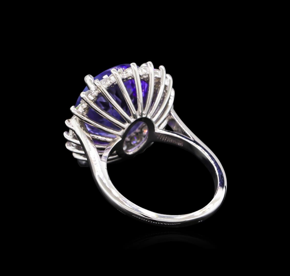 One electronically tested 14KT white gold ladies cast tanzanite and diamond ring with a bright polish finish. The featured tanzanite is set within a diamond bezel supported by a ribbed under gallery, completed by a two millimeter wide band. Identified with markings of "14K". Condition is new, good workmanship. Containing: One prong set oval mixed cut natural tanzanite, measuring 15.10 x 12.50 x 7.10mm, approximate weight of 9.62ct., clarity is eye clean, type I, medium dark, very slightly grayish, violet color, (GIA V 6/3), cut is good. Transmitting light with no distortion, transparent. Colored Stone Grading Report attached. Graded in the setting. Tanzanite is a very rare gemstone that is only found in the country of Tanzania. Originally discovered in 1967. Tiffany & Company, named the stone Tanzanite. It is found in the Usumburu Mountains that border the Umba Valley of northern Tanzania. Tanzanite occurs in gray, brown, violet, blue, reddish-purple, & green. The gem is interesting because of its exceptional pleochroism. Rotated in different directions a tanzanite will exhibit multiple changes of color. Tanzanite has a low tolerance to ultrasonic cleaning, and should not be cleaned using this method. Twenty prong set round brilliant cut diamonds approximate total weight of 20 Stones = 0.95ct. Clarity grade is an average for the group. Graded in the setting. Clarity: VS-2 to SI-2. Color: D - E. Total Weight of Colored Stones 9.62ct. Total Weight of Diamonds 0.95ct. Total Weight of Ring 7.84gm. AIG Appraised at $24,905.00.