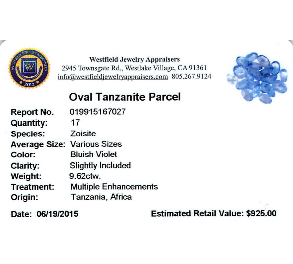 Seventeen oval mixed cut natural tanzanites exact total weight 9.62ct., clarity is slightly included, type I, medium dark, very slightly grayish, bluish violet color, (GIA bV 6/3), cut is good. Transmitting light with a minimum of distortion, transparent. Naturally occurring internal & external characteristics are present. Color grade is an average for the group. Tanzanite is a very rare gemstone that is only found in the country of Tanzania. Originally discovered in 1967. Tiffany & Company, named the stone Tanzanite. It is found in the Usumburu Mountains that border the Umba Valley of northern Tanzania. Tanzanite occurs in gray, brown, violet, blue, reddish-purple, & green. The gem is interesting because of its exceptional pleochroism. Rotated in different directions a tanzanite will exhibit multiple changes of color. Tanzanite has a low tolerance to ultrasonic cleaning, and should not be cleaned using this method. Westfield Appraised at $925.00.