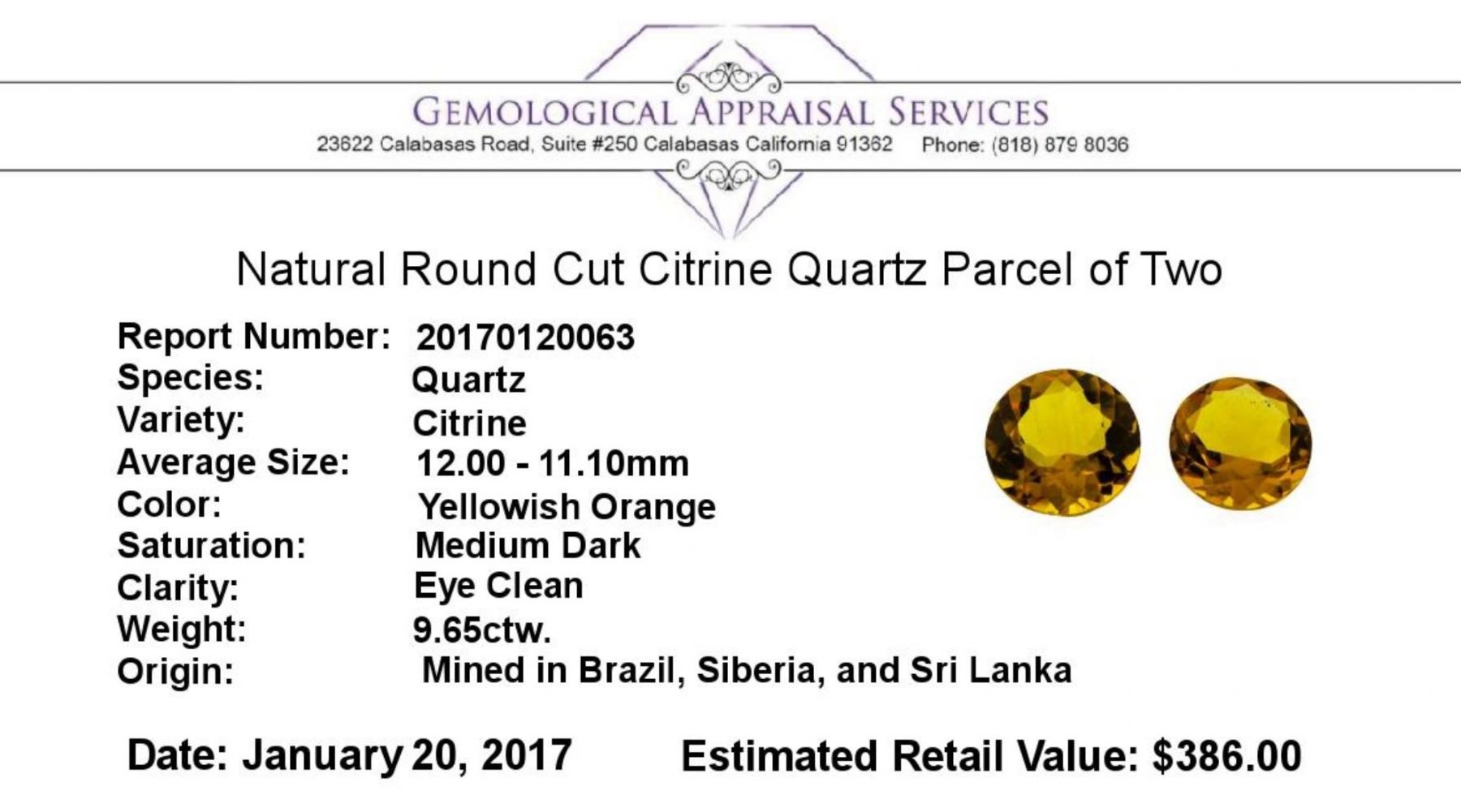One natural round cut citrine quartz parcel of two with an exact weight of 9.65ctw., clarity is eye clean, yellowish orange, medium dark. Gemological Appraisals Services estimates the retail value at $386 GAS Appraised.