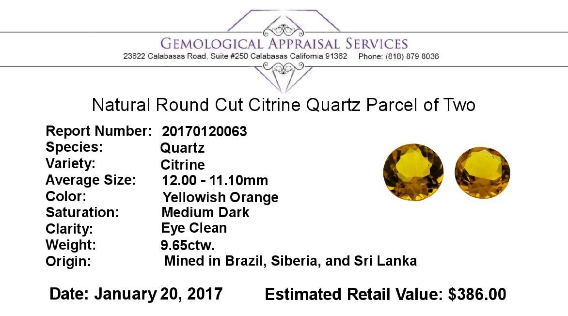 One natural round cut citrine quartz parcel of two with an exact weight of 9.65ctw., clarity is eye clean, yellowish orange, medium dark. Gemological Appraisals Services estimates the retail value at $386