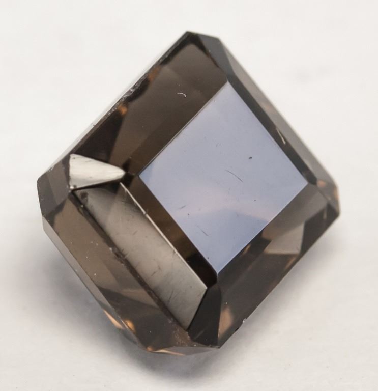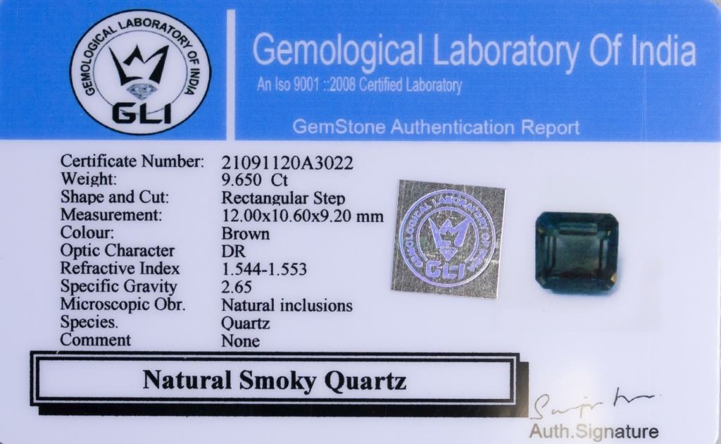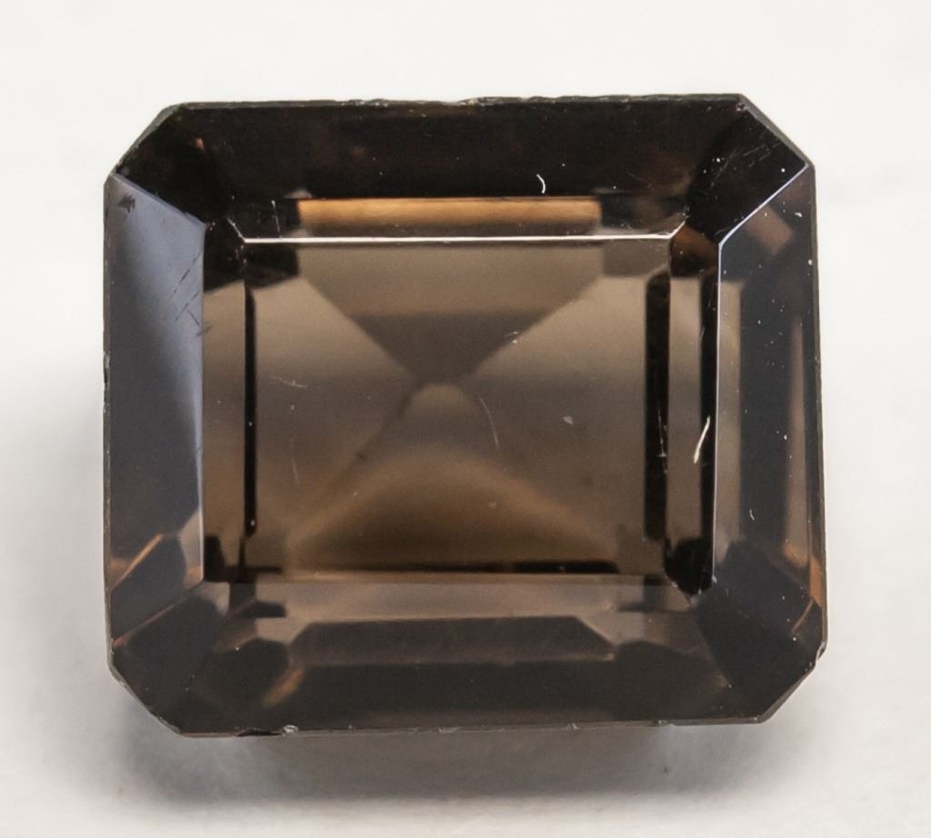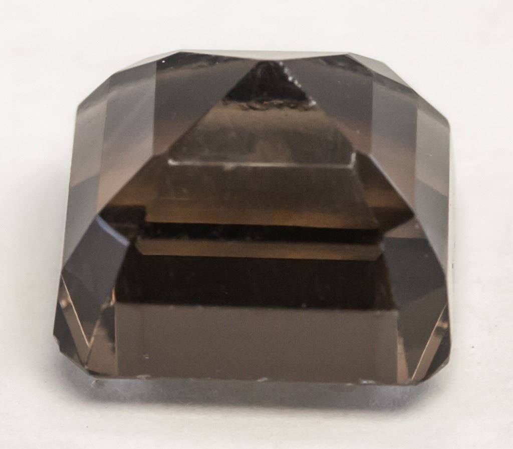 9.65 ct rectangular step cut brown natural smoky quartz. Accompanied with GLI certificate. 12.00 x 10.60 x 9.20 mm.