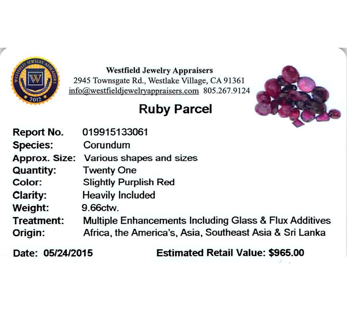 Twenty-one various shapes & sizes cut natural rubies exact total weight 9.66ct., clarity is heavily included, type II, dark, very slightly brownish, slightly purplish red color, (GIA slpR 7/3), cut is good. Transmitting light somewhat diffusely, transparent to translucent. Naturally occurring internal & external characteristics are present. Indications of laboratory high temperature heat treatment, with glass & flux additives. Ruby has a low tolerance to rhodium plating, repolishing the surface, & ultrasonic cleaning. Westfield Appraised at $965.00.