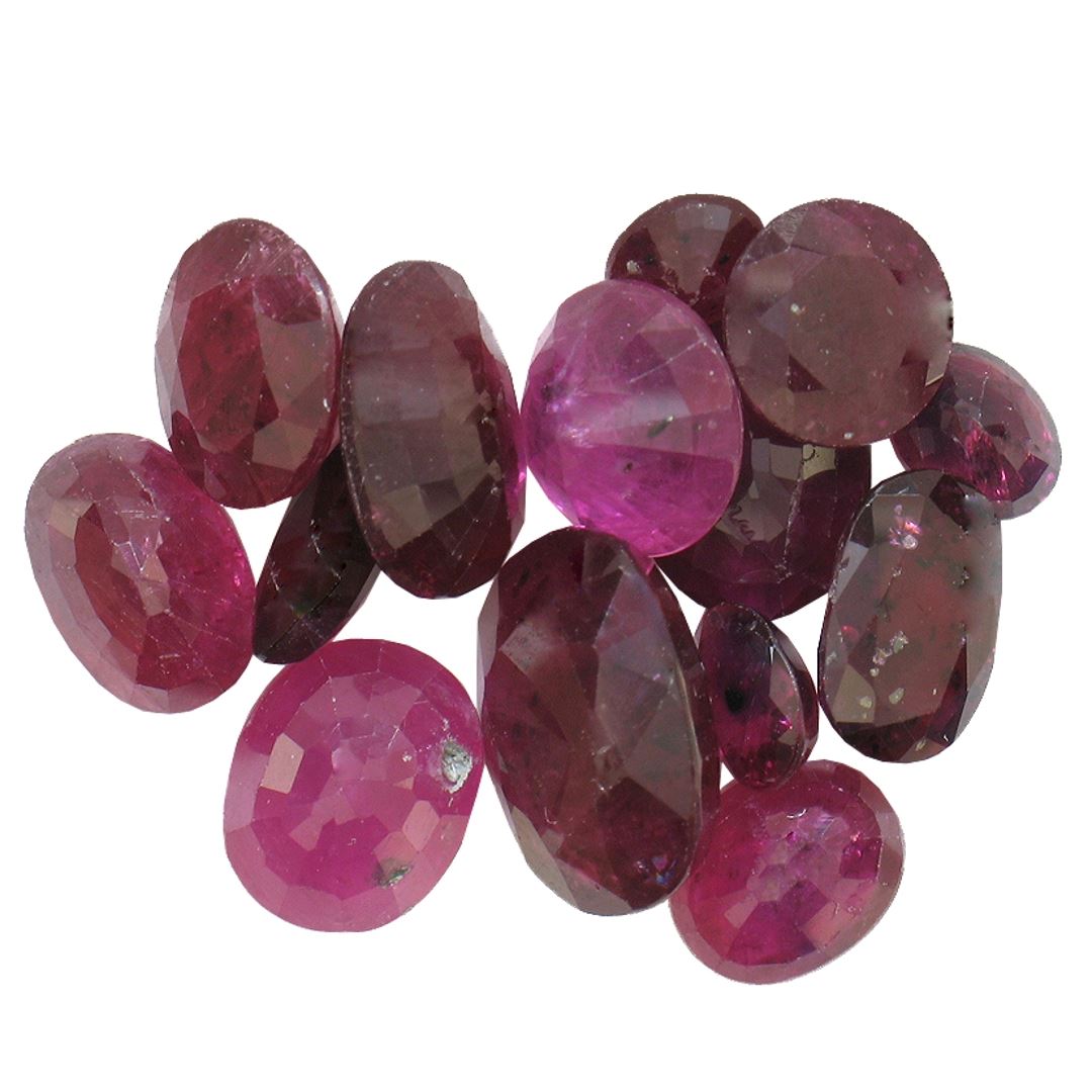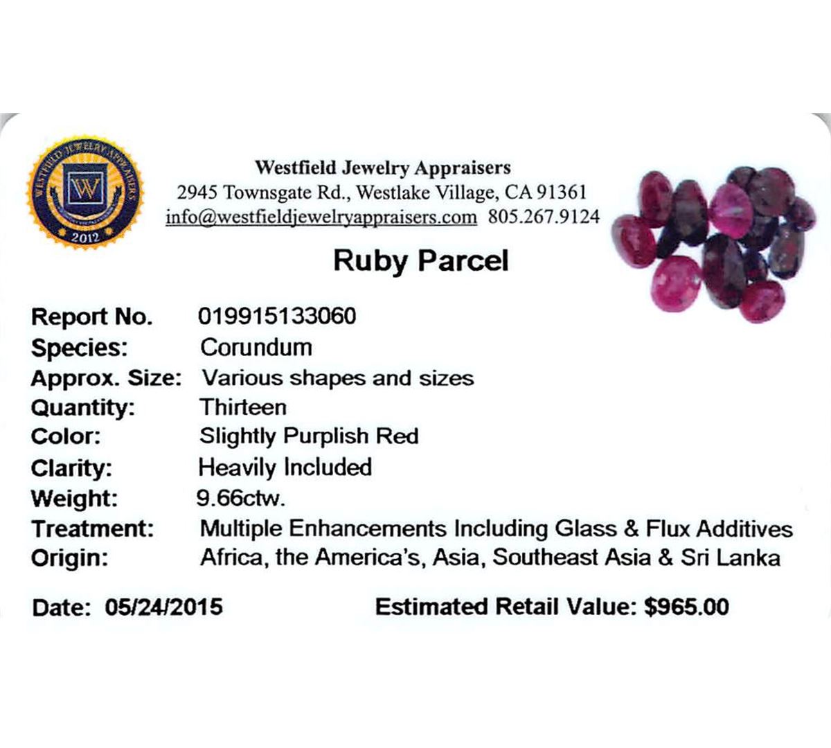 Thirteen various shapes & sizes cut natural rubies exact total weight 9.66ct., clarity is heavily included, type II, dark, very slightly brownish, slightly purplish red color, (GIA slpR 7/3), cut is good. Transmitting light somewhat diffusely, transparent to translucent. Naturally occurring internal & external characteristics are present. Indications of laboratory high temperature heat treatment, with glass & flux additives. Ruby has a low tolerance to rhodium plating, repolishing the surface, & ultrasonic cleaning. Westfield Appraised at $965.00.