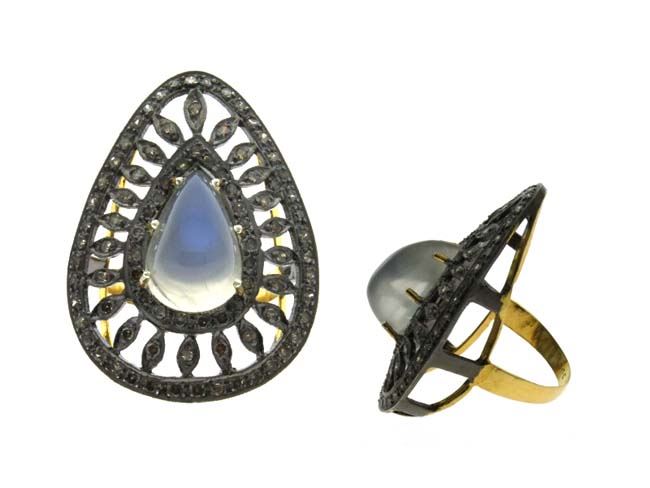 DROP SHAPE RAINBOW MOONSTONE AND DIAMOND RING/Diamond Count 1:/Diamond Total Carat :1.45/Diamond Color & Clarity:J-L/I1-I2 Single Cut /Diamond Count 2:/Diamond 2 CTW:/Diamond Count 3:/Gemstone Count 1:/Gemstone CTW:8.22/Gemstone Dimension:/Gemstone Shape:Pear-Rainbow Moonstone /Gemstone Count 2:/Gemstone Shape:/Ring Dimension:/Metal Type 1:14kYellow Gold :Gram Weight:2.5/Metal Type 2:over0.925Sterling Silver / Weight Gram:2.79/Gross Weight :8.22/Ring Size:7