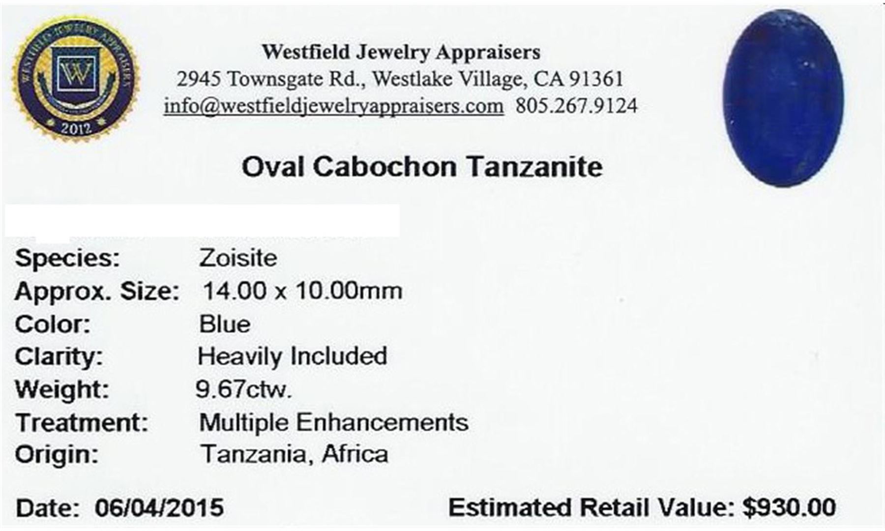 One oval cabochon cut natural tanzanite, measuring 15.00 x 11.00 x 6.00mm, exact weight 9.67ct., clarity is heavily included, type I, dark, moderately strong, blue color, (GIA B 7/4), cut is good. Transmitting light somewhat diffusely, transparent to translucent. Naturally occurring internal & external characteristics are present. Indications of heat treatment. Westfield Appraised at $930.00.