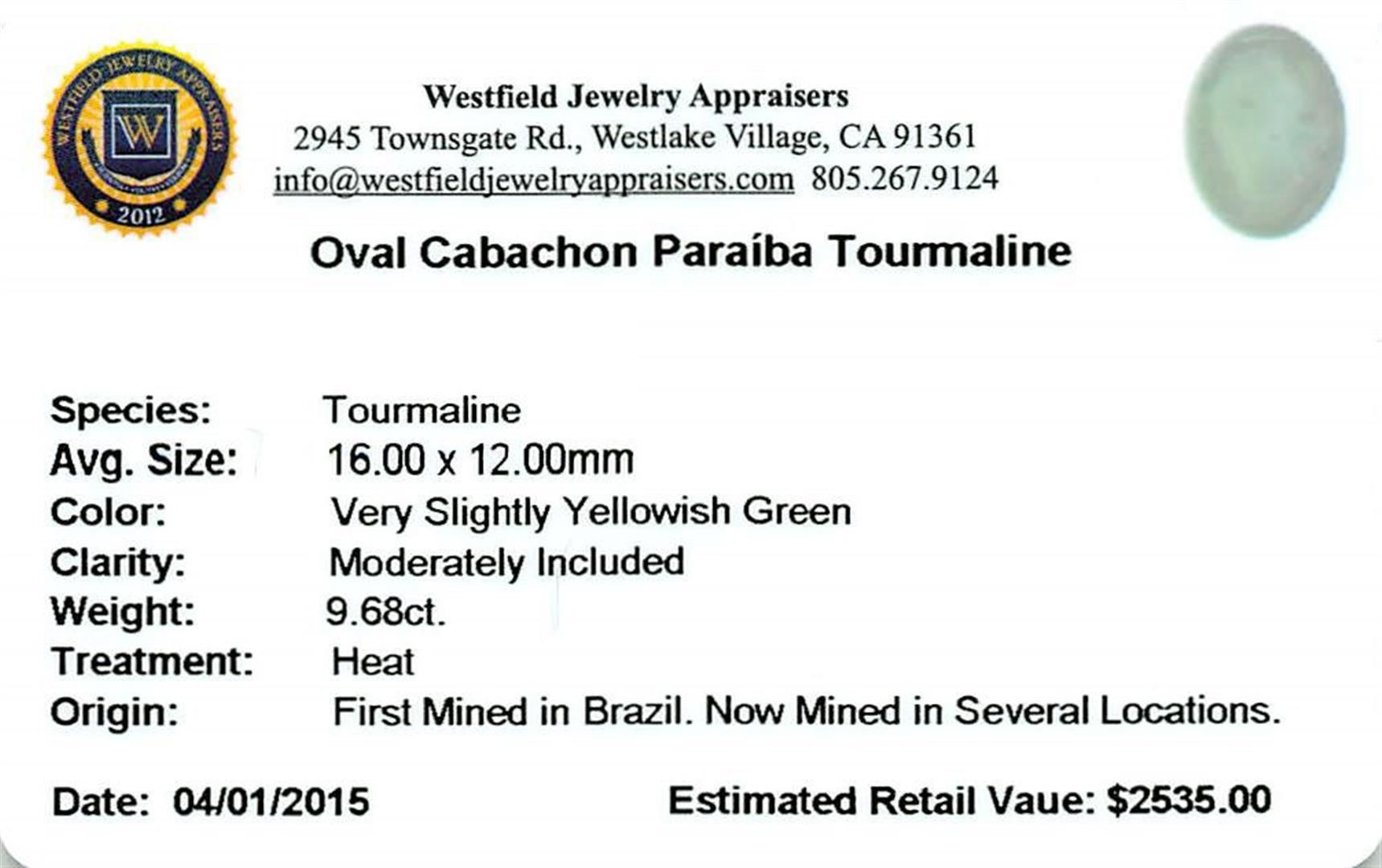 One oval cabochon cut natural Paraiba tourmaline exact weight 9.68ct., clarity is moderately included, cut is good. Westfield Appraised at $2,535.00.