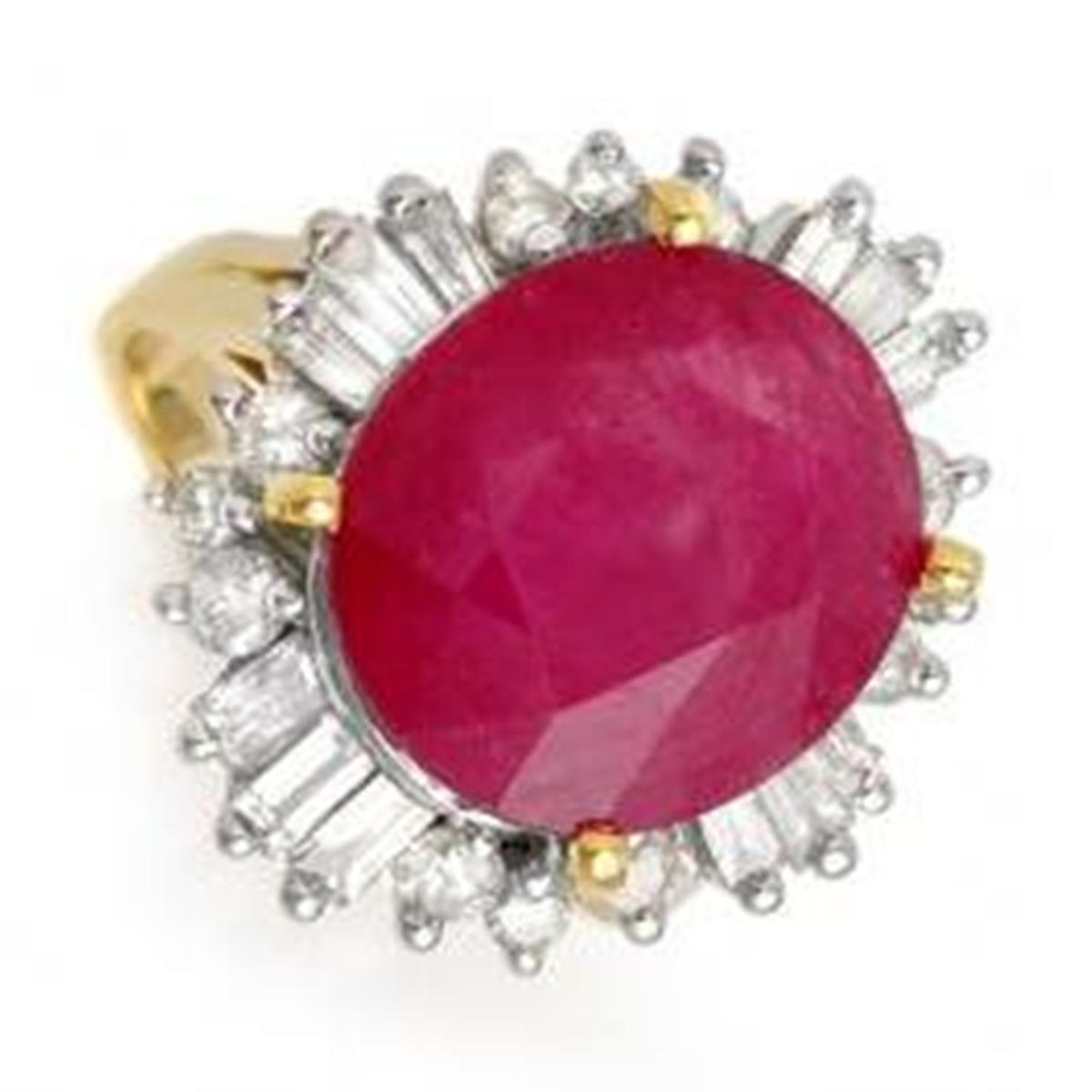 Diamond: 12 RD & BGT cut @ 1.23 ctw Clarity: SI-I Color: H-K Gemstone: Natural Ruby Gemstone color: RedGemstone quality: Good-to-Very Good Gemstone Cut & Weight: 1 Oval cut @ 8.45 ctw Metal Purity & Color : 14K Gold-Yellow Gold weight: 6.90 grams Ring size (US): 7Dimension: Approx. 3/4" x 5/8"