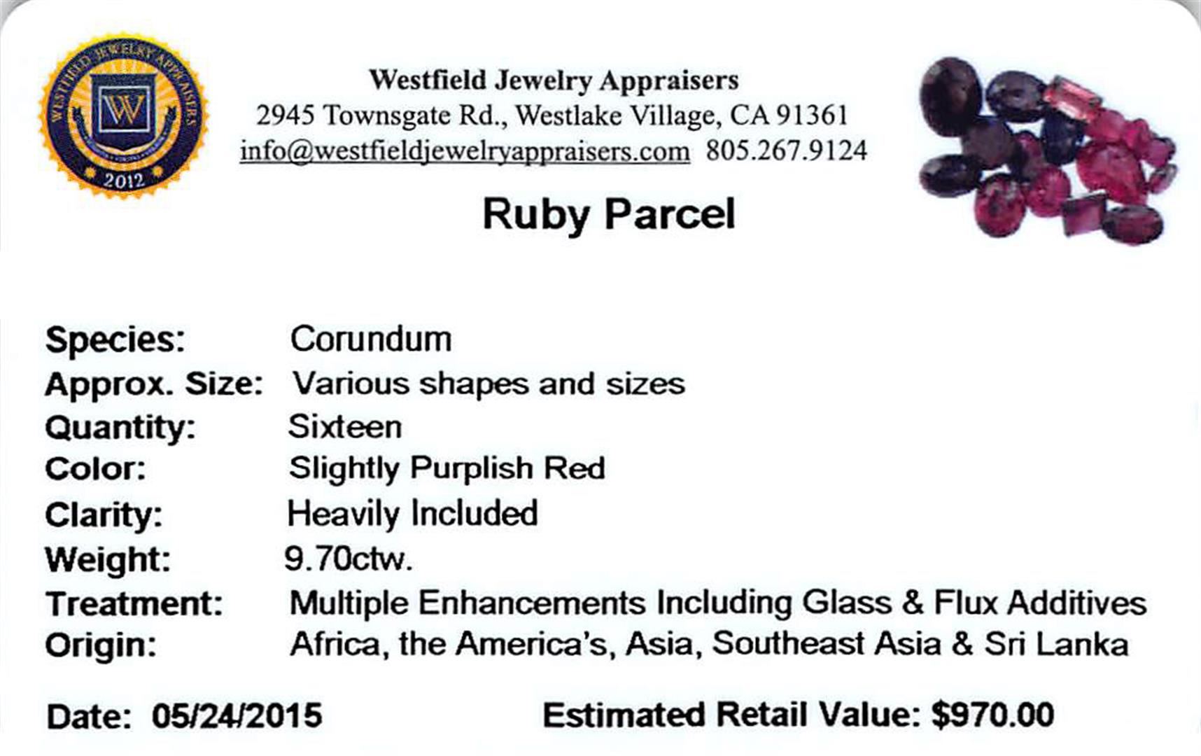 Sixteen various shapes & sizes cut natural rubies exact total weight 9.70ct., clarity is heavily included, type II, dark, very slightly brownish, slightly purplish red color, (GIA slpR 7/3), cut is good. Transmitting light somewhat diffusely, transparent to translucent. Naturally occurring internal & external characteristics are present. Indications of laboratory high temperature heat treatment, with glass & flux additives. Ruby has a low tolerance to rhodium plating, repolishing the surface, & ultrasonic cleaning. Westfield Appraised at $970.00.