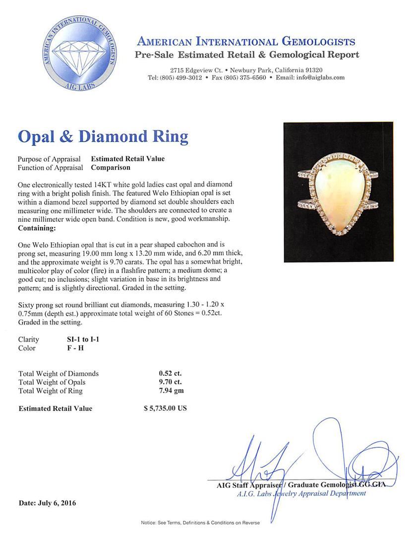 One electronically tested 14KT white gold ladies cast opal and diamond ring with a bright polish finish. The featured Welo Ethiopian opal is set within a diamond bezel supported by diamond set double shoulders each measuring one millimeter wide. The shoulders are connected to create a nine millimeter wide open band. Condition is new, good workmanship. Containing: One semi crystal opal that is cut in a pear shaped cabochon and is prong set, measuring 19.00 mm long x 13.20 mm wide, and 6.20 mm thick and the approximate weight is 9.70 carats. The opal has a somewhat bright, multicolor play of color (fire) in a flashfire pattern; a medium dome; a good cut; no inclusions; slight variation in base in its brightness and pattern; and is slightly directional. Graded in the setting. Sixty prong set round brilliant cut diamonds, measuring 1.30 - 1.20 x 0.75mm (depth est.) approximate total weight of 60 Stones = 0.52ct. Graded in the setting. Clarity: SI-1 to I-1. Color: F - H. Total Weight of Diamonds 0.52ct. Total Weight of Opals 9.70ct. Total Weight of Ring 7.94gm. AIG Appraised at $5,735.00.