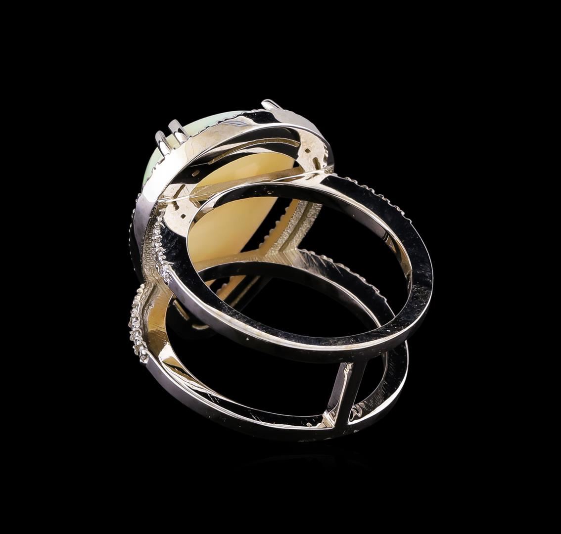 One electronically tested 14KT white gold ladies cast opal and diamond ring with a bright polish finish. The featured Welo Ethiopian opal is set within a diamond bezel supported by diamond set double shoulders each measuring one millimeter wide. The shoulders are connected to create a nine millimeter wide open band. Condition is new, good workmanship. Containing: One semi crystal opal that is cut in a pear shaped cabochon and is prong set, measuring 19.00 mm long x 13.20 mm wide, and 6.20 mm thick and the approximate weight is 9.70 carats. The opal has a somewhat bright, multicolor play of color (fire) in a flashfire pattern; a medium dome; a good cut; no inclusions; slight variation in base in its brightness and pattern; and is slightly directional. Graded in the setting. Sixty prong set round brilliant cut diamonds, measuring 1.30 - 1.20 x 0.75mm (depth est.) approximate total weight of 60 Stones = 0.52ct. Graded in the setting. Clarity: SI-1 to I-1. Color: F - H. Total Weight of Diamonds 0.52ct. Total Weight of Opals 9.70ct. Total Weight of Ring 7.94gm. AIG Appraised at $5,735.00.