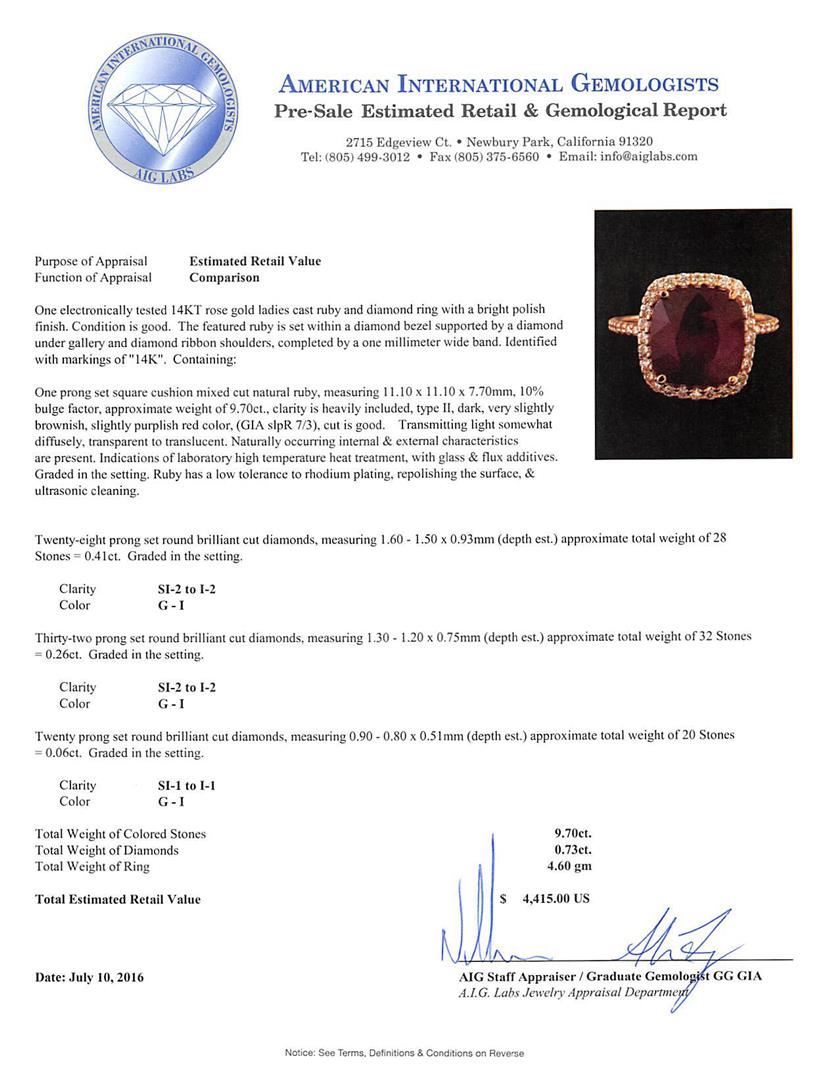 One electronically tested 14KT rose gold ladies cast ruby and diamond ring with a bright polish finish. The featured ruby is set within a diamond bezel supported by a diamond under gallery and diamond ribbon shoulders, completed by a one millimeter wide band. Identified with markings of '14K'. Condition is good. Containing: One prong set square cushion mixed cut natural ruby, measuring 11.10 x 11.10 x 7.70mm, 10%. bulge factor, approximate weight of 9.70ct., clarity is heavily included, type II, dark, very slightly brownish, slightly purplish red color, (GIA slpR 7/3), cut is good. Transmitting light somewhat diffusely, transparent to translucent. Naturally occurring internal & external characteristics are present. Indications of laboratory high temperature heat treatment, with glass & flux additives. Graded in the setting. Ruby has a low tolerance to rhodium plating, repolishing the surface, & ultrasonic cleaning. Twenty-Eight prong set round brilliant cut diamonds, measuring 1.60 - 1.50 x 0.93mm (depth est.) approximate total weight of 28 Stones = 0.41ct. Graded in the setting. Clarity SI-2 to I-2. Color: G - I Thirty-Two prong set round brilliant cut diamonds, measuring 1.30 - 1.20 x 0.75mm (depth est.) approximate total weight of 32 Stones = 0.26ct. Graded in the setting. Clarity SI-2 to I-2. Color: G - I Twenty prong set round brilliant cut diamonds, measuring 0.90 - 0.80 x 0.51mm (depth est.) approximate total weight of 20 Stones = 0.06ct. Graded in the setting. Clarity SI-1 to I-1. Color: G - I. Total Weight of Colored Stones 9.70ct.. Total Weight of Diamonds 0.73ct.. Total Weight of Ring 4.60gm. AIG Appraised at $4,415.00.