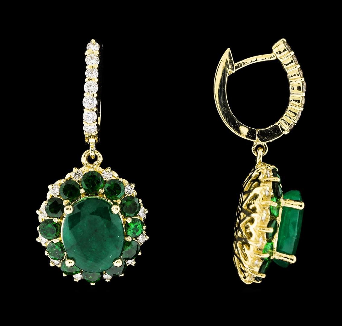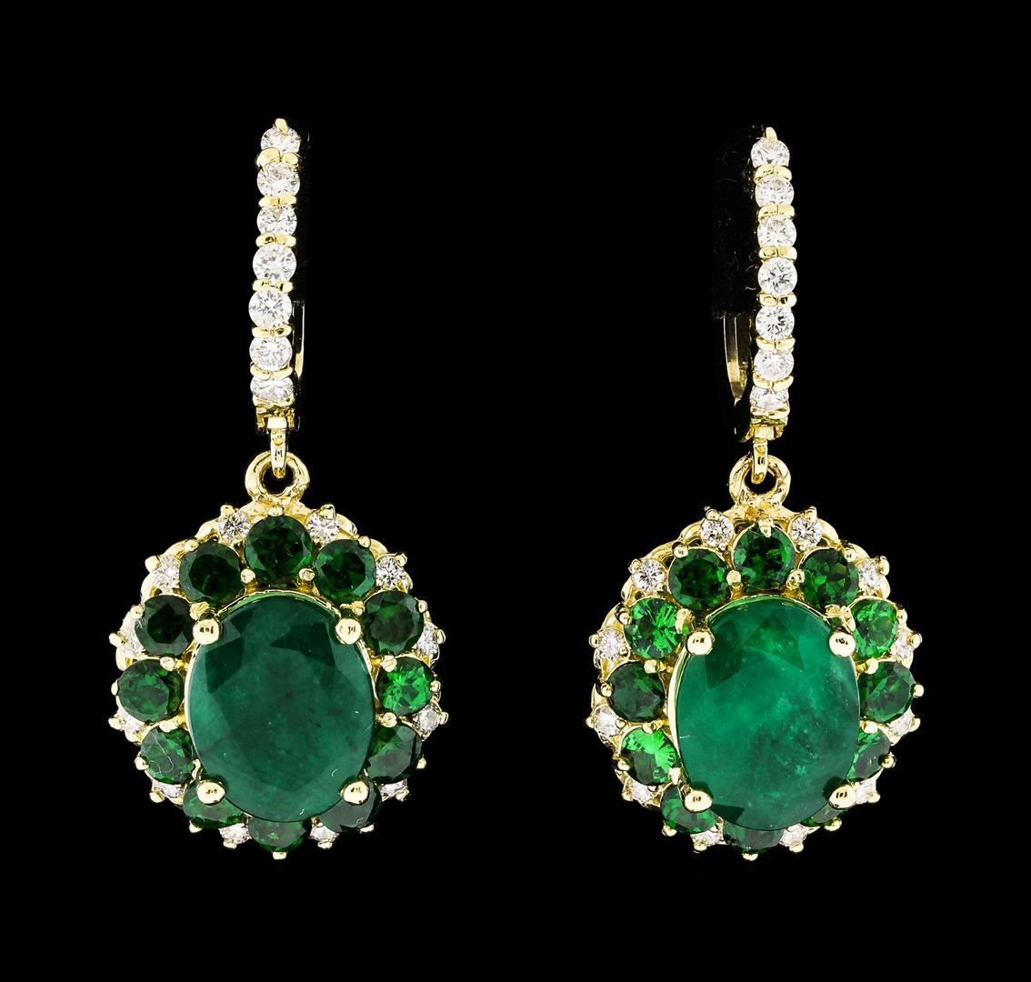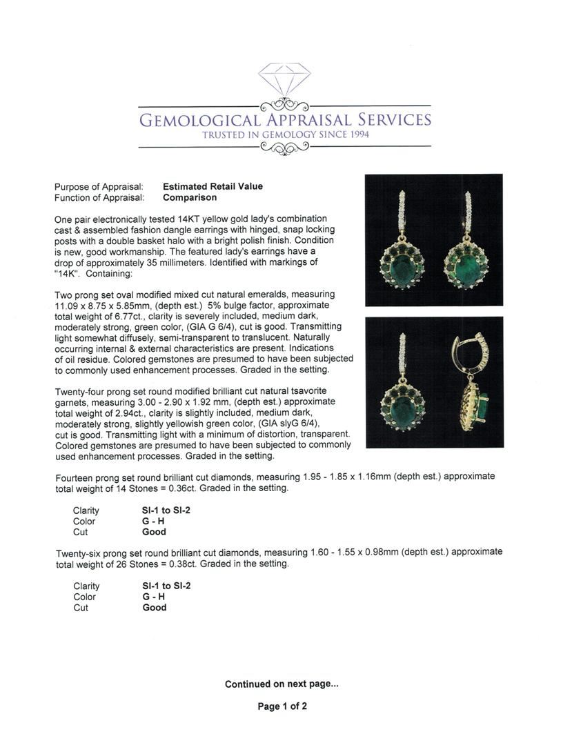 One pair electronically tested 14KT yellow gold lady's combination cast & assembled fashion dangle earrings with hinged, snap locking posts with a double basket halo with a bright polish finish. The featured lady's earrings have a drop of approximately 35 millimeters. Identified with markings of '14K'. Condition is new, good workmanship. Containing: Two prong set oval modified mixed cut natural emeralds, measuring 11.09 x 8.75 x 5.85mm, (depth est.) 5%. bulge factor, approximate total weight of 6.77ct., clarity is severely included, medium dark, moderately strong, green color, (GIA G 6/4), cut is good. Transmitting light somewhat diffusely, semi-transparent to translucent. Naturally occurring internal & external characteristics are present. Indications of oil residue. Colored gemstones are presumed to have been subjected to commonly used enhancement processes. Graded in the setting. Twenty-four prong set round modified brilliant cut natural tsavorite garnets, measuring 3.00 - 2.90 x 1.92 mm, (depth est.) approximate total weight of 2.94ct., clarity is slightly included, medium dark, moderately strong, slightly yellowish green color, (GIA slyG 6/4), cut is good. Transmitting light with a minimum of distortion, transparent. Colored gemstones are presumed to have been subjected to commonly used enhancement processes. Graded in the setting. Fourteen prong set round brilliant cut diamonds, measuring 1.95 - 1.85 x 1.16mm (depth est.) approximate total weight of 14 Stones = 0.36ct. Graded in the setting. Clarity SI-1 to SI-2. Color: G - H Cut Good Twenty-Six prong set round brilliant cut diamonds, measuring 1.60 - 1.55 x 0.98mm (depth est.) approximate total weight of 26 Stones = 0.38ct. Graded in the setting. Clarity SI-1 to SI-2. Color: G - H Cut Good. Total Weight of Colored Stones 9.71ct.. Total Weight of Diamonds 0.74ct.. Total Weight of Earrings 11.10gm GAS Appraised at $11,655.00.