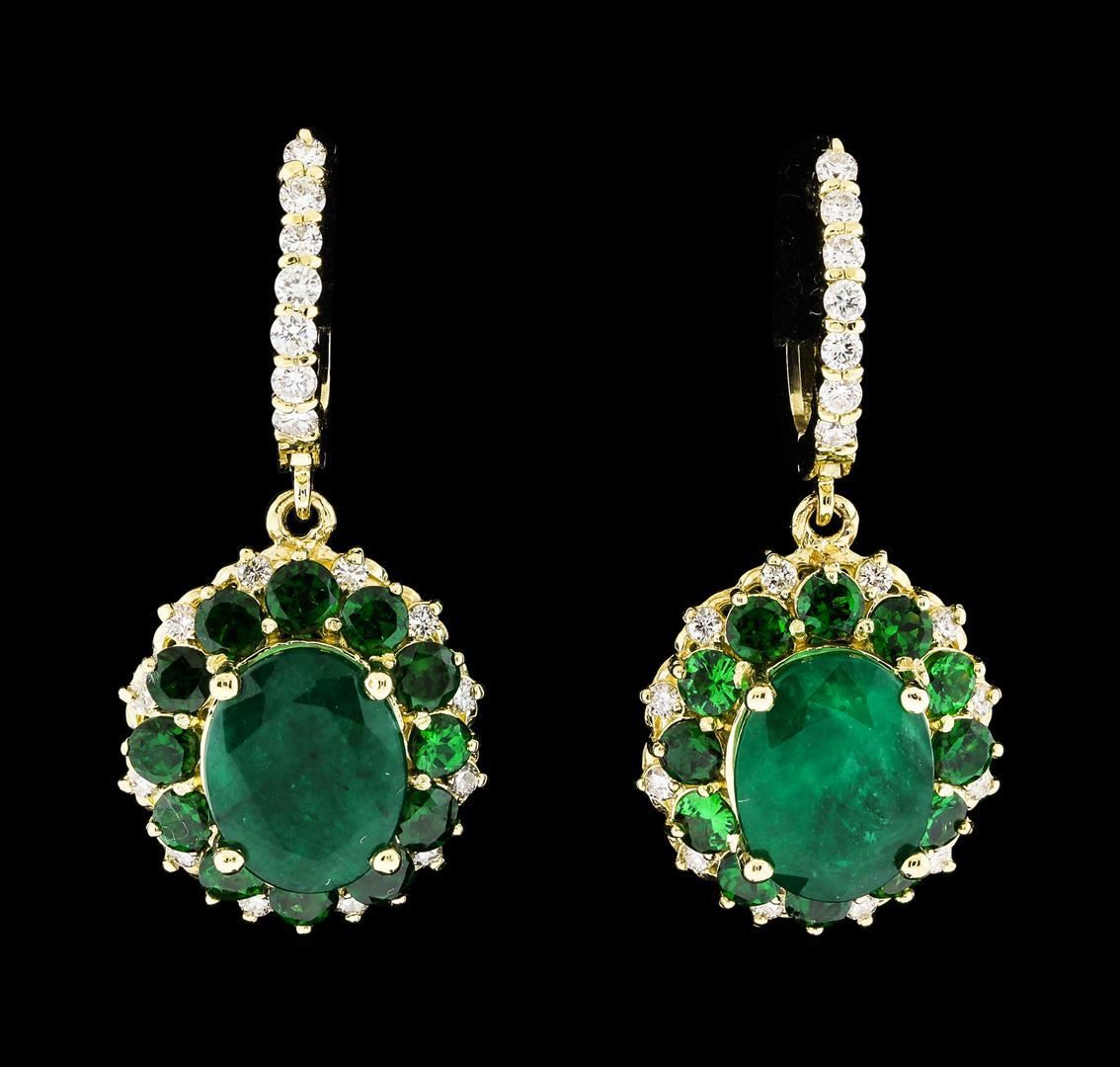 One pair electronically tested 14KT yellow gold lady's combination cast & assembled fashion dangle earrings with hinged, snap locking posts with a double basket halo with a bright polish finish. The featured lady's earrings have a drop of approximately 35 millimeters. Identified with markings of '14K'. Condition is new, good workmanship. Containing: Two prong set oval modified mixed cut natural emeralds, measuring 11.09 x 8.75 x 5.85mm, (depth est.) 5%. bulge factor, approximate total weight of 6.77ct., clarity is severely included, medium dark, moderately strong, green color, (GIA G 6/4), cut is good. Transmitting light somewhat diffusely, semi-transparent to translucent. Naturally occurring internal & external characteristics are present. Indications of oil residue. Colored gemstones are presumed to have been subjected to commonly used enhancement processes. Graded in the setting. Twenty-four prong set round modified brilliant cut natural tsavorite garnets, measuring 3.00 - 2.90 x 1.92 mm, (depth est.) approximate total weight of 2.94ct., clarity is slightly included, medium dark, moderately strong, slightly yellowish green color, (GIA slyG 6/4), cut is good. Transmitting light with a minimum of distortion, transparent. Colored gemstones are presumed to have been subjected to commonly used enhancement processes. Graded in the setting. Fourteen prong set round brilliant cut diamonds, measuring 1.95 - 1.85 x 1.16mm (depth est.) approximate total weight of 14 Stones = 0.36ct. Graded in the setting. Clarity SI-1 to SI-2. Color: G - H Cut Good Twenty-Six prong set round brilliant cut diamonds, measuring 1.60 - 1.55 x 0.98mm (depth est.) approximate total weight of 26 Stones = 0.38ct. Graded in the setting. Clarity SI-1 to SI-2. Color: G - H Cut Good. Total Weight of Colored Stones 9.71ct.. Total Weight of Diamonds 0.74ct.. Total Weight of Earrings 11.10gm GAS Appraised.