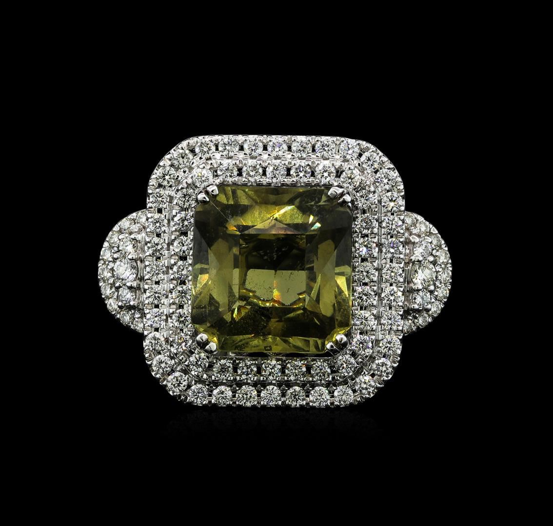 One electronically tested 14KT white gold lady's cast fashion ring with a double cushion halo with a bright polish finish. The featured lady's ring has a shank measuring 3.55 millimeters wide. Identified with markings of '14K'. Condition is new, good workmanship. Containing: One prong set emerald modified brilliant cut natural yellow sapphire-unenhanced, measuring 11.88 x 11.48 x 7.08mm, (depth est.) approximate weight of 9.71ct., clarity is slightly included, medium, very slightly brownish, greenish yellow color, (GIA gY 5/3), cut is very good. Transmitting light with a minimum of distortion, transparent. No indications of heat treatment. Graded in the setting in the GIA Laboratory, Report #2173500739. Twelve invisible set princess cut diamonds, measuring 2.30 x 2.20 x 1.65mm (depth est.) approximate total weight of 12 Stones = 0.82ct. Graded in the setting. Clarity VS-1 to VS-2. Color: H - I Cut Very Good Two prong set round brilliant cut diamonds, measuring 2.20 - 2.15 x 1.35mm (depth est.) approximate total weight of 2 Stones = 0.08ct. Graded in the setting. Clarity SI-1. Color: I Cut Good One Hundred Eight prong set round brilliant cut diamonds, measuring 1.40 - 1.20 x 0.81mm (depth est.) approximate total weight of 108 Stones = 0.94ct. Graded in the setting. Clarity VS-2 to SI-1. Color: G - H Cut Good. Total Weight of Colored Stones 9.71ct.. Total Weight of Diamonds 1.84ct.. Total Weight of Ring 13.10gm GAS Appraised at $34,795.00.