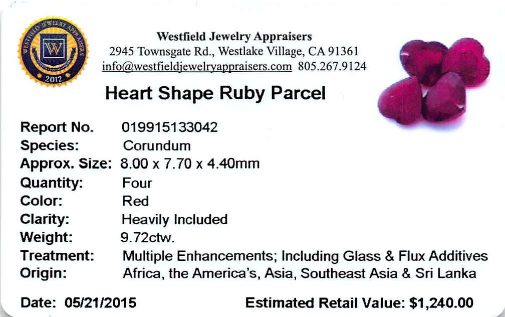 Four heart mixed cut natural rubies, measuring 8.00 x 7.70 x 4.40mm, exact total weight 9.72ct., clarity is heavily included, type II, dark, very slightly brownish, red color, (GIA R 7/3), cut is good. Measurements are an average for the group. Transmitting light somewhat diffusely, transparent to translucent. Naturally occurring internal & external characteristics are present. Indications of laboratory high temperature heat treatment, with glass & flux additives. Ruby has a low tolerance to rhodium plating, & ultrasonic cleaning. Westfield Appraised at $1,240.00.