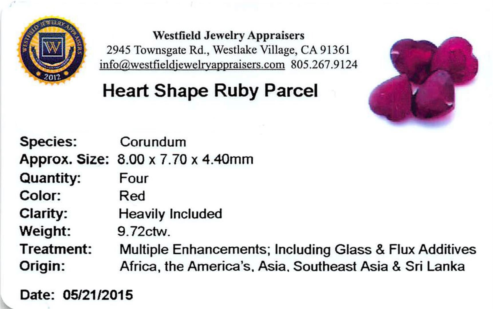Four heart mixed cut natural rubies, measuring 8.00 x 7.70 x 4.40mm, exact total weight 9.72ct., clarity is heavily included, type II, dark, very slightly brownish, red color, (GIA R 7/3), cut is good. Measurements are an average for the group. Transmitting light somewhat diffusely, transparent to translucent. Naturally occurring internal & external characteristics are present. Indications of laboratory high temperature heat treatment, with glass & flux additives. Ruby has a low tolerance to rhodium plating, & ultrasonic cleaning. UGS Appraised.