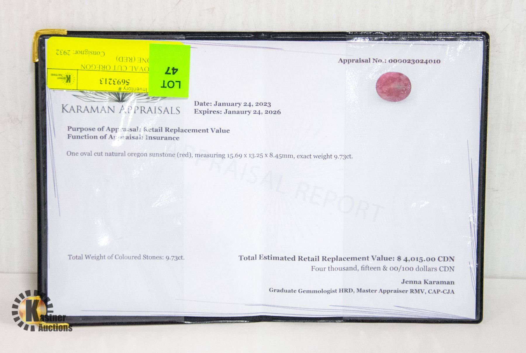 MEASURING 15.69 X 13.25 X 8.45MM. COLORED STONE. COMES WITH APPRAISAL FROM KARAMAN APPRAISALS (000023024010) APPRAISED VALUE $4,015.00 **ALL ITEMS MUST BE REMOVED BY 5PM SATURDAY, OCTOBER 21ST 2023. ALL REMAINING ITEMS WILL BE SUBJECT TO A $6.00 PER DAY STORAGE CHARGE. ANY ITEMS REMAINING AFTER MONDAY, NOVEMBER 6TH, 2023 WILL BE CONSIDERED FORFEITED. NO REFUNDS WILL BE ISSUED FOR FORFEITED ITEMS. TO SCHEDULE A PICK UP APPOINTMENT CLICK HERE