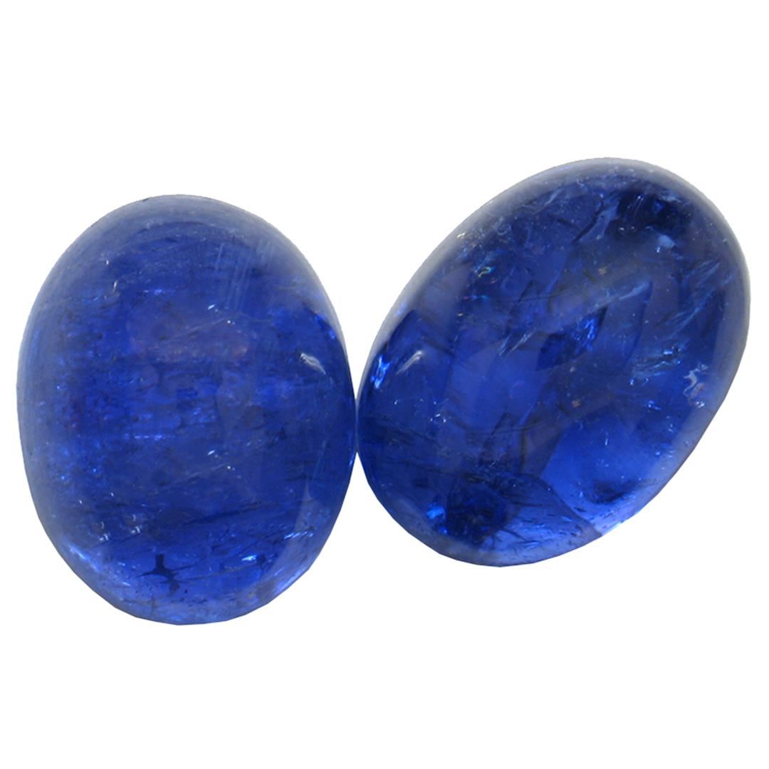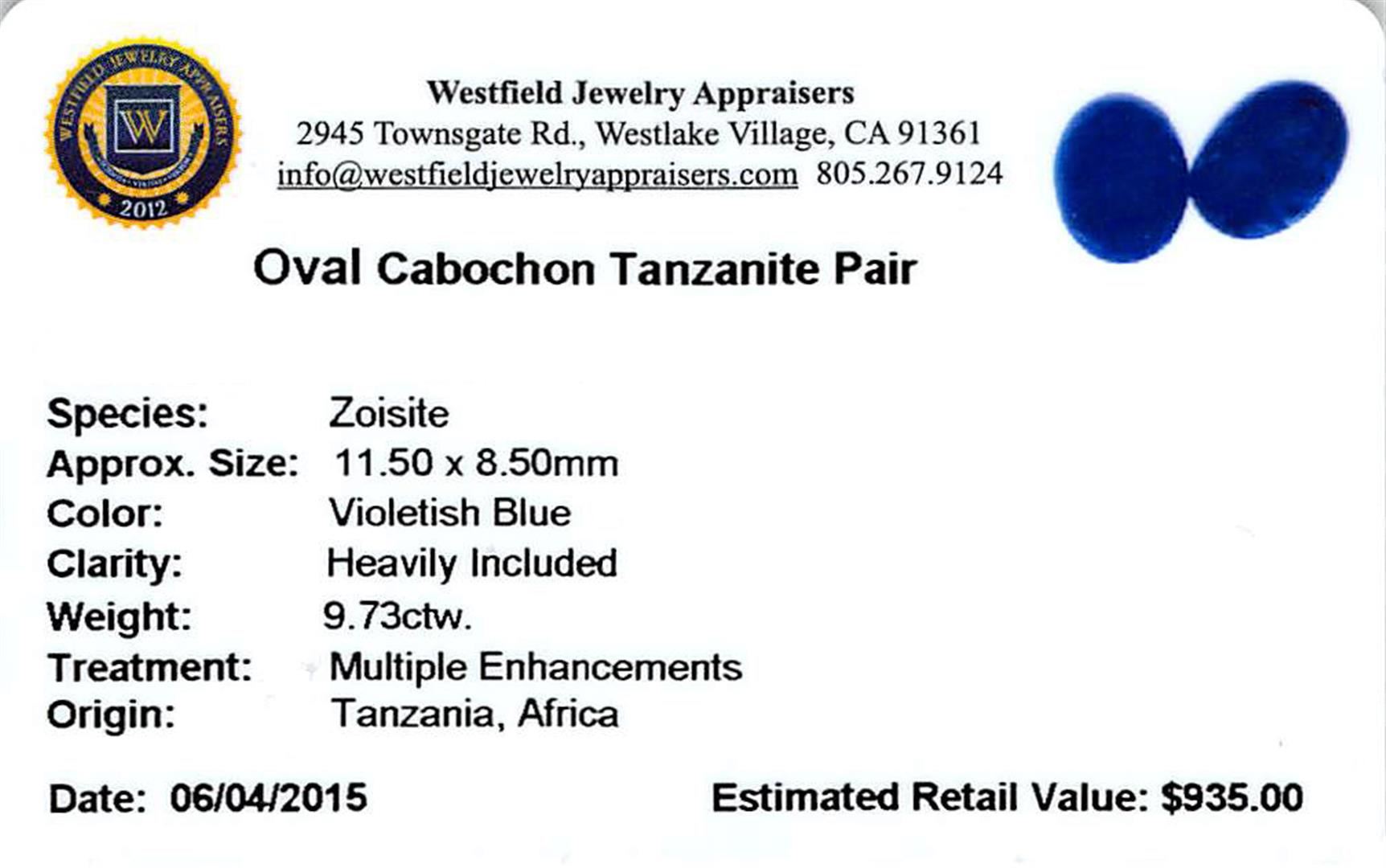 Two oval cabochon cut natural tanzanites, measuring 11.50 x 8.50 x 5.00mm, exact total weight 9.73ct., clarity is heavily included, type I, dark, moderately strong, violetish blue color, (GIA vB 7/4), cut is good. Transmitting light somewhat diffusely, transparent to translucent. Naturally occurring internal & external characteristics are present. Measurements & the color grade are an average for the pair. Tanzanite is a very rare gemstone that is only found in the country of Tanzania. Originally discovered in 1967. Tiffany & Company, named the stone Tanzanite. It is found in the Usumburu Mountains that border the Umba Valley of northern Tanzania. Tanzanite occurs in gray, brown, violet, blue, reddish-purple, & green. The gem is interesting because of its exceptional pleochroism. Rotated in different directions a tanzanite will exhibit multiple changes of color. Tanzanite has a low tolerance to ultrasonic cleaning, and should not be cleaned using this method. Westfield Appraised at $935.00.