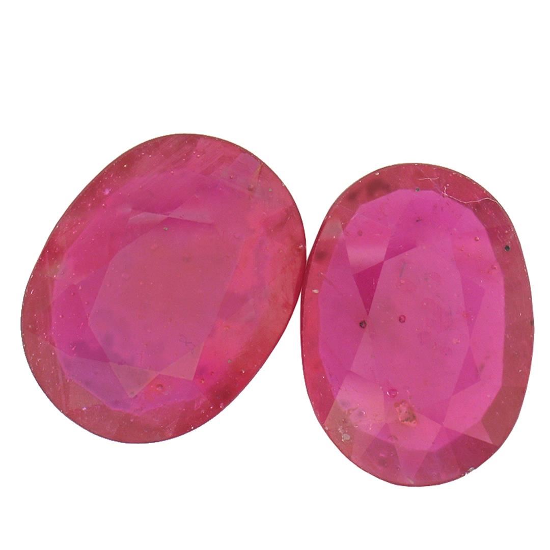 Two oval mixed cut natural rubies, measuring 14.00 x 10.00 x 3.00mm, exact total weight 9.73ct., clarity is heavily included, type II, medium dark, very slightly brownish, slightly purplish red color, (GIA slpR 6/3), cut is good. Color & clarity grade are an average for the group, Indications of multiple laboratory enhancements, including high temperature heat treatment, Measurements are an average for the pair. Westfield Appraised at $1,310.00.