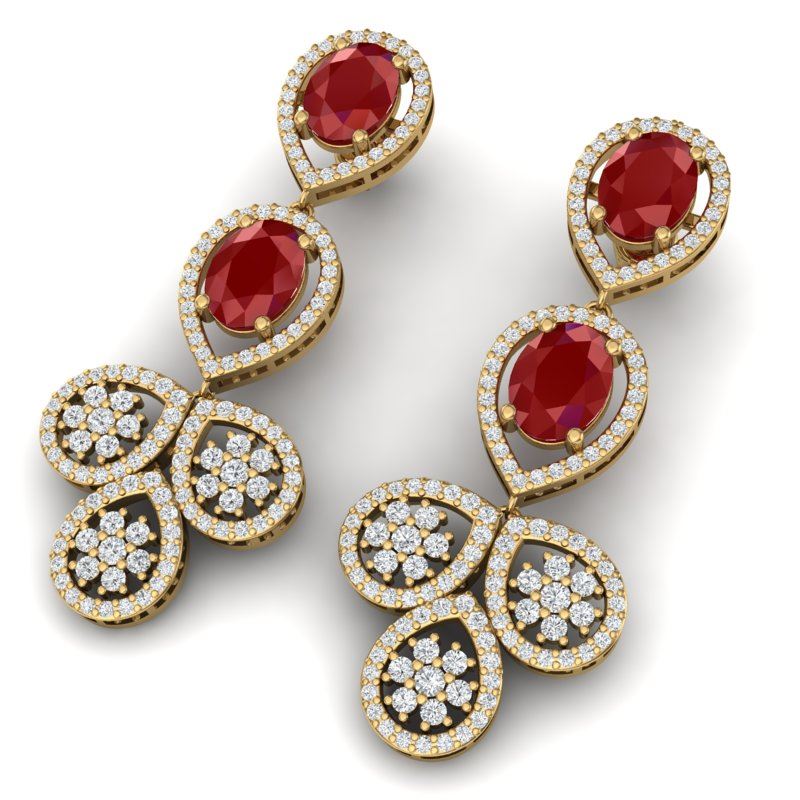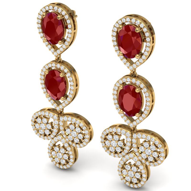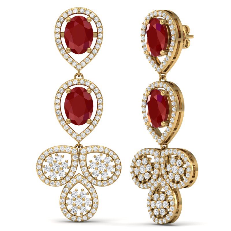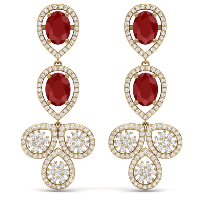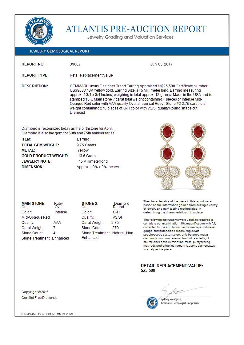 9.75 CTW Royalty Designer Ruby & VS Diamond Earrings 18K Yellow Gold ---- Luxury Designer Brand Earring Appraised Retail Price at $25,500  ---- SKU Number US39083 18K Yellow gold Earring Size is 45 Millimeter long, Earring measuring approx. 1 3/4 x 3/4 Inches, weighing in total approx. 12 grams. Made in the USA and is stamped 18K, Main stone 7 carat total weight containing 4 pieces of Intense Mid-Opaque Red color with AAA quality Oval shape cut Ruby , Stone #2 2.75 carat total weight containing 270 pieces of G-H color with VS/SI quality Round shape cut