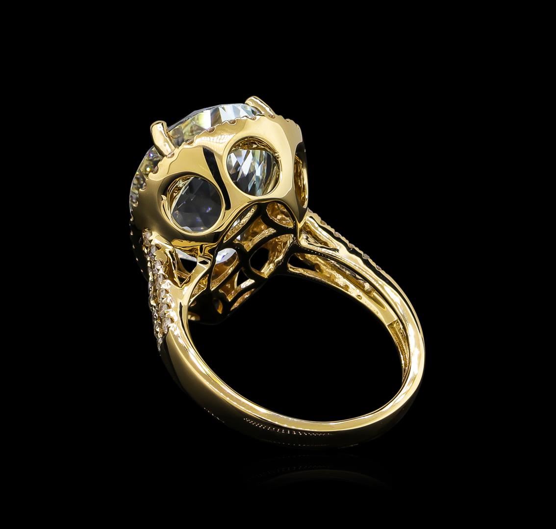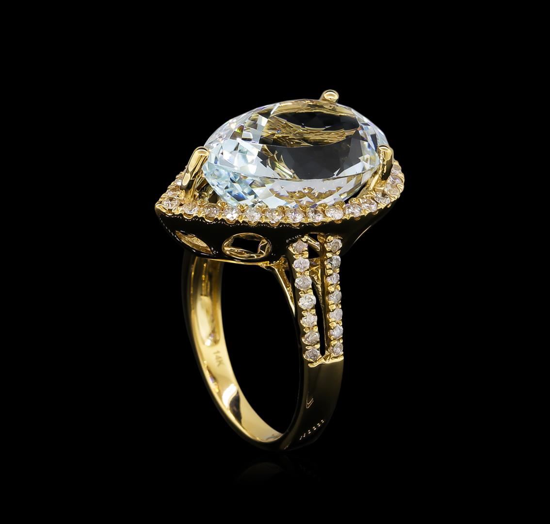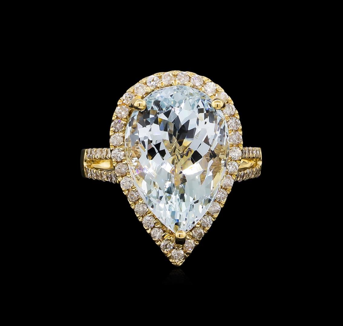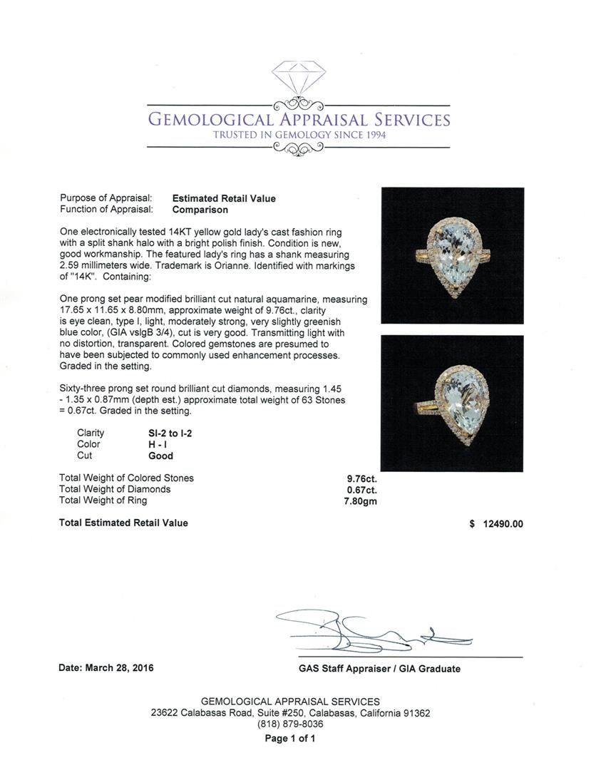 One electronically tested 14KT yellow gold lady's cast fashion ring with a split shank halo with a bright polish finish. The featured lady's ring has a shank measuring 2.59 millimeters wide. Trademark is Orianne. Identified with markings of '14K'. Condition is new, good workmanship. Containing: One prong set pear modified brilliant cut natural aquamarine, measuring 17.65 x 11.65 x 8.80mm, approximate weight of 9.76ct., clarity is eye clean, type I, light, moderately strong, very slightly greenish blue color, (GIA vslgB 3/4), cut is very good. Transmitting light with no distortion, transparent. Colored gemstones are presumed to have been subjected to commonly used enhancement processes. Graded in the setting. Sixty-Three prong set round brilliant cut diamonds, measuring 1.45 - 1.35 x 0.87mm (depth est.) approximate total weight of 63 Stones = 0.67ct. Graded in the setting. Clarity SI-2 to I-2. Color: H - I Cut Good. Total Weight of Colored Stones 9.76ct.. Total Weight of Diamonds 0.67ct.. Total Weight of Ring 7.80gm. GAS Appraised at $12,490.00.