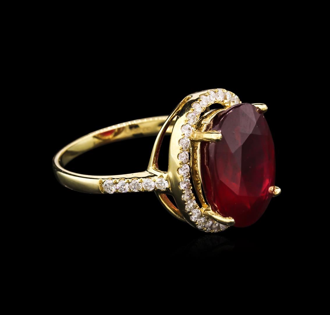 One 14KT yellow gold ruby and diamond ring. An oval cut ruby corundum gemstone is prong mounted in the center of the ring. Round brilliant cut diamonds accent the ring around the center gemstone. The ring is cast stamped "14K" and has a gross weight of 4.80 grams. Gemstone(s): Stone: Ruby corundum. Nature: Natural. Shape: Oval, faceted. Quantity: 1 , mounted. Weight: 9.77ct. Dimensions: 13.97 x 10.74mm. Bulge: Visible. Clarity: I1, Type 2. Color: Red (5/5). Symmetry: Very good. Color Intensity: Medium. Transparency: Transparent. Tone: Dark. Enhancements: Indications of high temperature heat treatment, with glass and flux additives. Diamond(s): Shape: Round brilliant cut. Weight: 0.50ct. Average Clarity: I1-I2. Average Color: H-J. Symmetry: Very good. Polish: Very good. GGA Appraised at $5,430.00.