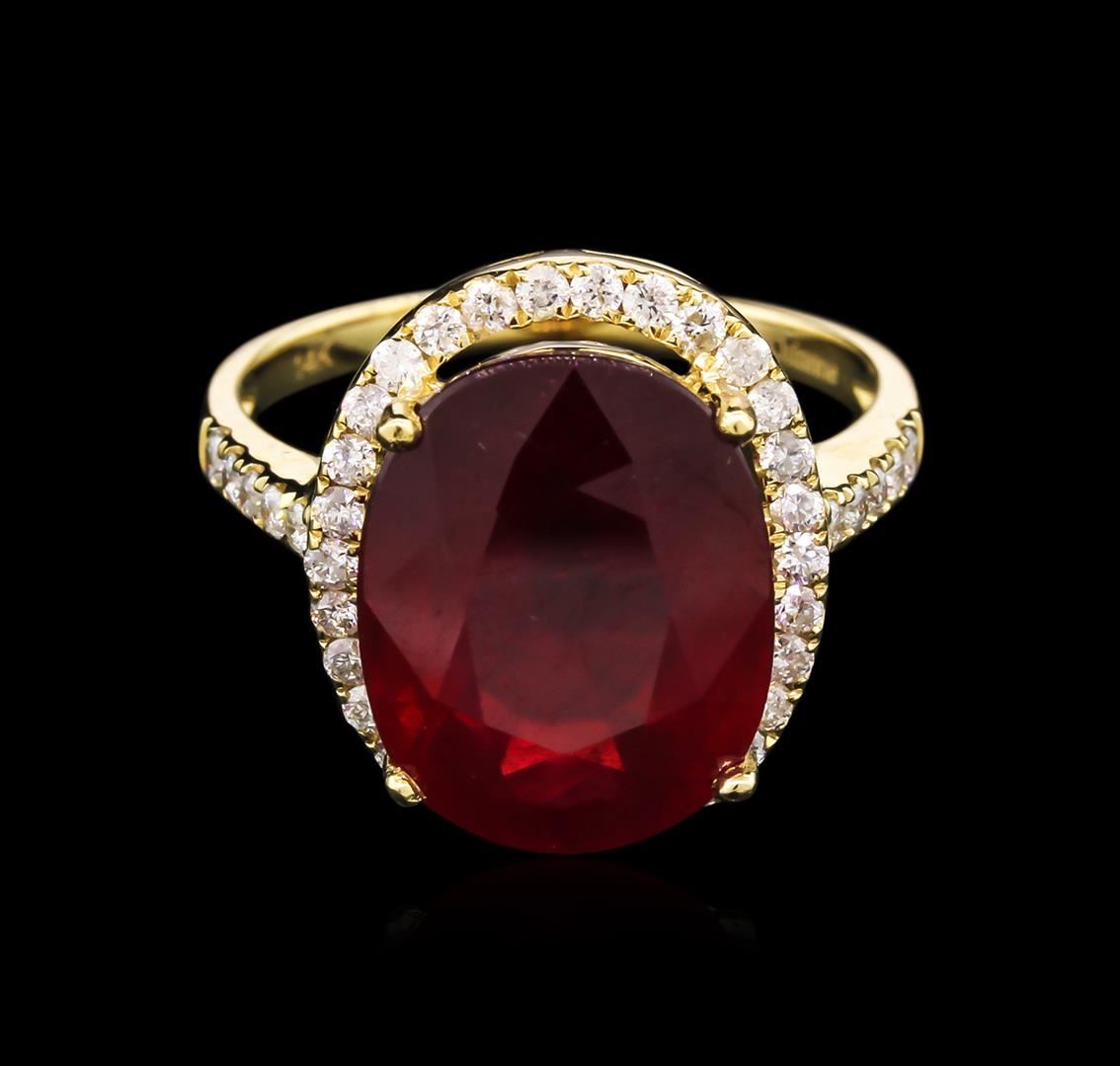 One 14KT yellow gold ruby and diamond ring. An oval cut ruby corundum gemstone is prong mounted in the center of the ring. Round brilliant cut diamonds accent the ring around the center gemstone. The ring is cast stamped "14K" and has a gross weight of 4.80 grams. Gemstone(s): Stone: Ruby corundum. Nature: Natural. Shape: Oval, faceted. Quantity: 1 , mounted. Weight: 9.77ct. Dimensions: 13.97 x 10.74mm. Bulge: Visible. Clarity: I1, Type 2. Color: Red (5/5). Symmetry: Very good. Color Intensity: Medium. Transparency: Transparent. Tone: Dark. Enhancements: Indications of high temperature heat treatment, with glass and flux additives. Diamond(s): Shape: Round brilliant cut. Weight: 0.50ct. Average Clarity: I1-I2. Average Color: H-J. Symmetry: Very good. Polish: Very good. GGA Appraised at $5,430.00.