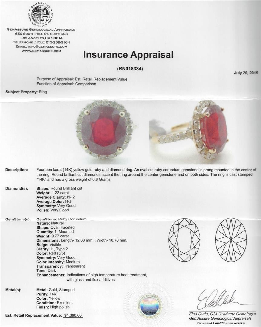 Fourteen karat (14K) yellow gold ruby and diamond ring. An oval cut ruby corundum gemstone is prong mounted in the center of the ring. Round brilliant cut diamonds accent the ring around the center gemstone and on both sides. The ring is cast stamped "14K" and has a gross weight of 6.8 Grams. Diamond(s): Shape: Round Brilliant cut. Weight: 1.22 carat. Average Clarity: I1-I2. Average Color: H-J. Symmetry: Very Good. Polish: Very Good. Gemstone(s): Gemstone: Ruby Corundum. Nature: Natural. Shape: Oval, Faceted. Quantity: 1, Mounted. Weight: 9.77 carat. Dimensions: Length- 12.63 mm. ; Width- 10.78 mm. Bulge: Visible. Clarity: I1, Type 2. Color: Red (5/5). Symmetry: Very Good. Color Intensity: Medium. Transparency: Transparent. Tone: Dark. Enhancements: Indications of high temperature heat treatment, with glass and flux additives. Metal(s): Metal: Gold, Stamped. Purity: 14K. Color: Yellow. Condition: Excellent. Finish: High polish. GGA Appraised at $4,390.00.
