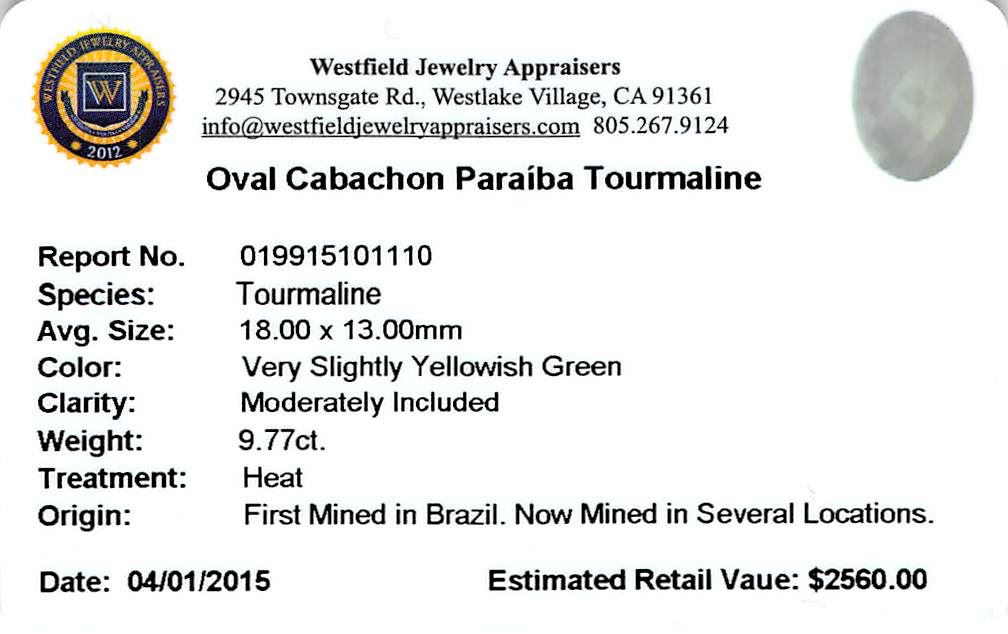 One oval cabochon cut natural Paraiba tourmaline exact weight 9.77ct., clarity is moderately included, cut is good. Westfield Appraised at $2,560.00.