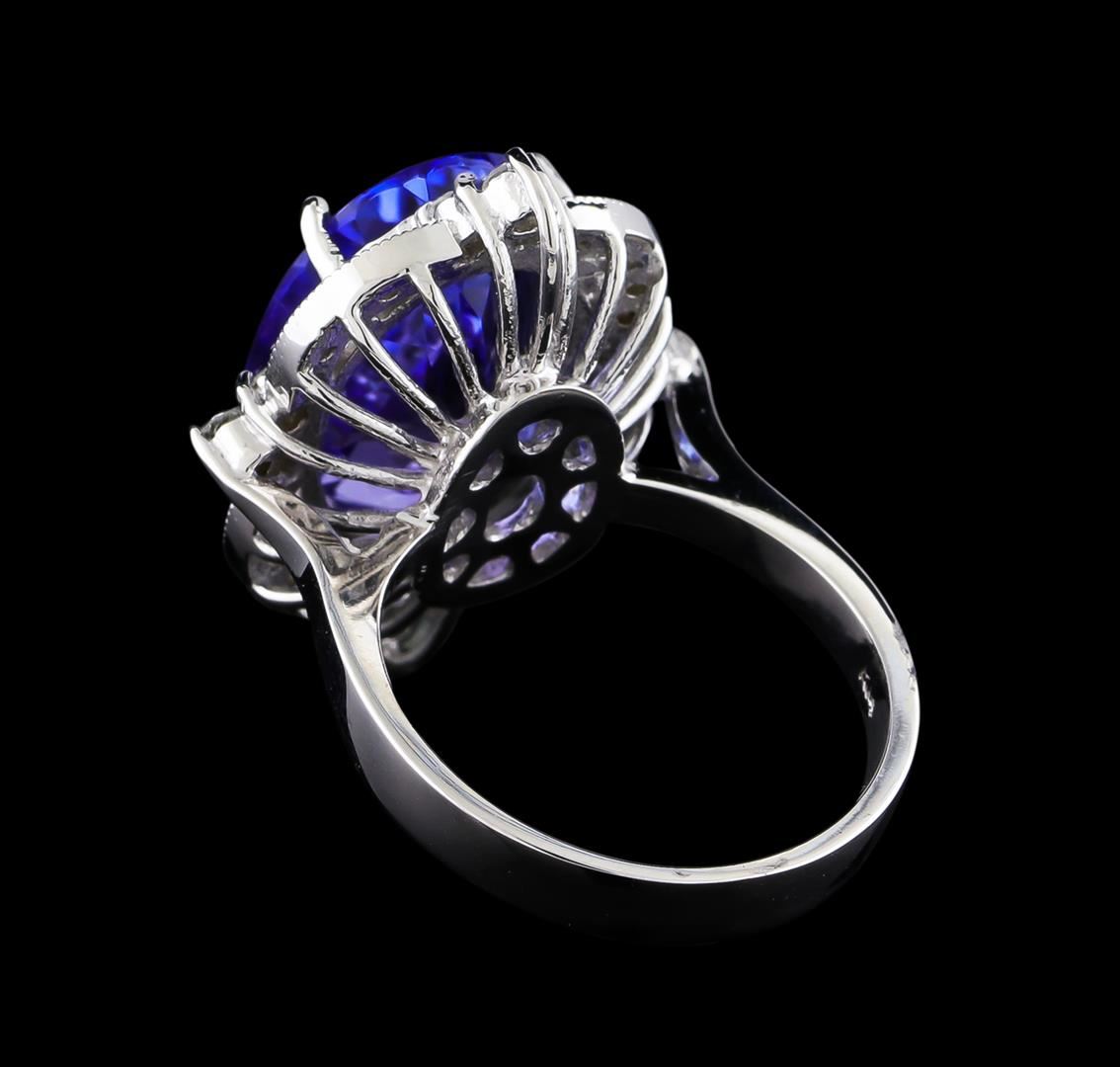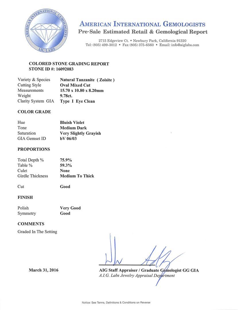 One electronically tested 14KT white gold ladies cast tanzanite and diamond ring. The featured tanzanite is set within a stylized diamond bezel supported by a ribbed under gallery, completed by a three millimeter wide band. Bright polish finish with milgrain detailing. Identified with markings of "K14". Condition is new, good workmanship. Containing: One prong set oval mixed cut natural tanzanite, measuring 15.70 x 10.80 x 8.20mm, approximate weight of 9.78ct., clarity is eye clean, type I, medium dark, very slightly grayish, bluish violet color, (GIA bV 6/3), cut is good. Transmitting light with no distortion, transparent. Colored Stone Grading Report attached. Graded in the setting. Tanzanite is a very rare gemstone that is only found in the country of Tanzania. Originally discovered in 1967. Tiffany & Company, named the stone Tanzanite. It is found in the Usumburu Mountains that border the Umba Valley of northern Tanzania. Tanzanite occurs in gray, brown, violet, blue, reddish-purple, & green. The gem is interesting because of its exceptional pleochroism. Rotated in different directions a tanzanite will exhibit multiple changes of color. Tanzanite has a low tolerance to ultrasonic cleaning, and should not be cleaned using this method. Twelve prong set round brilliant cut diamonds, measuring 2.00 - 1.90 x 1.17mm (depth est.) approximate total weight of 12 Stones = 0.33ct. Graded in the setting. Clarity: SI-2 to I-2. Color: G - H Twenty prong set round brilliant cut diamonds, measuring 1.30 - 1.25 x 0.77mm (depth est.) approximate total weight of 20 Stones = 0.15ct. Graded in the setting. Clarity: SI-2 to I-2. Color: G - I. Total Weight of Colored Stones 9.78ct. Total Weight of Diamonds 0.48ct. Total Weight of Ring 9.74gm. AIG Appraised at $23,755.00.