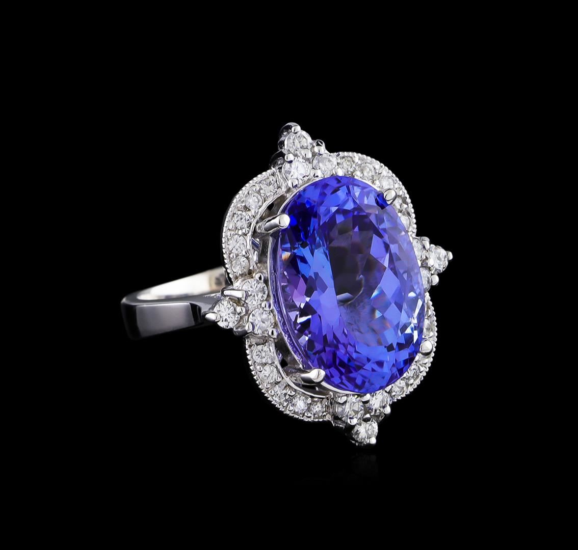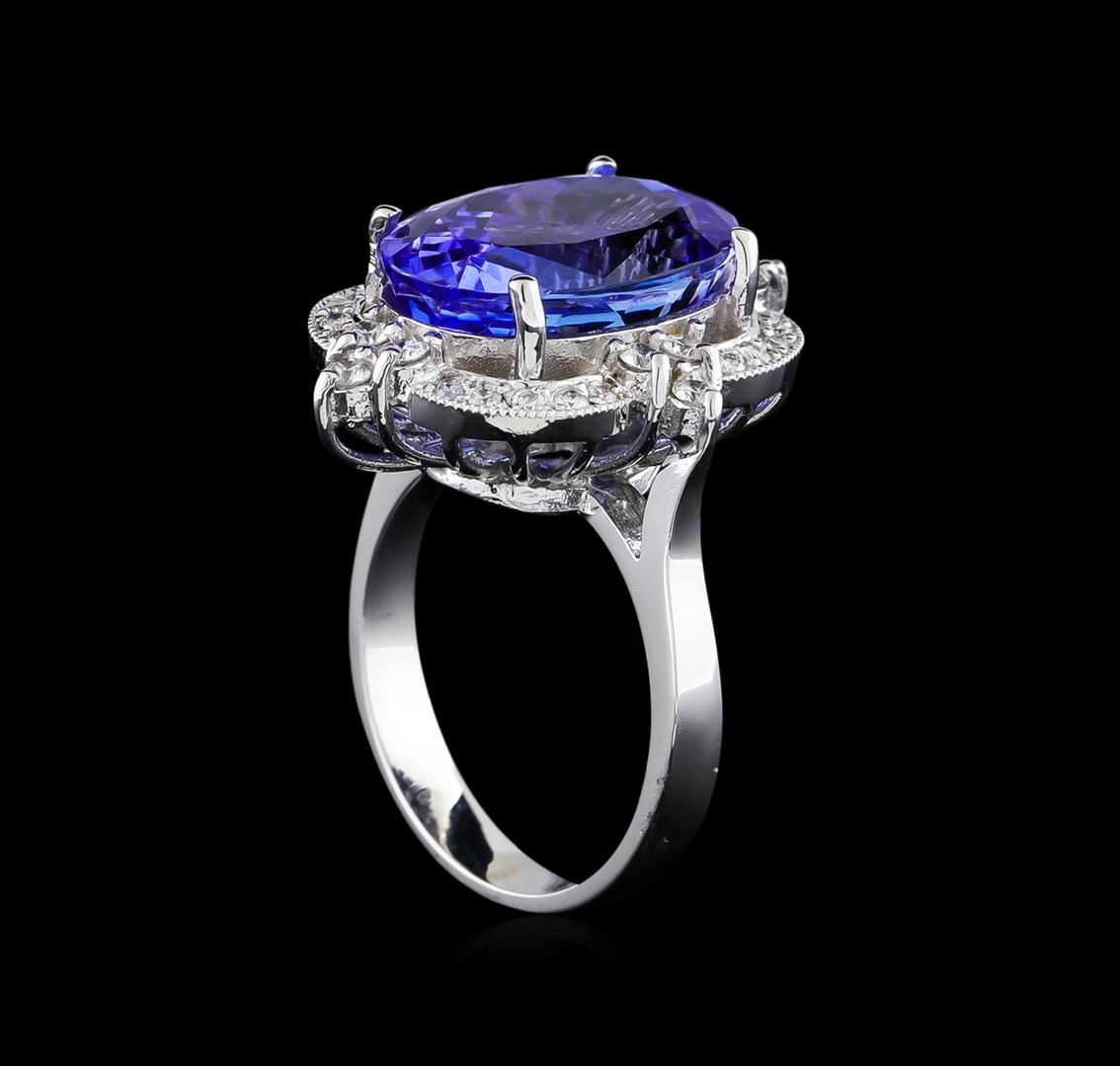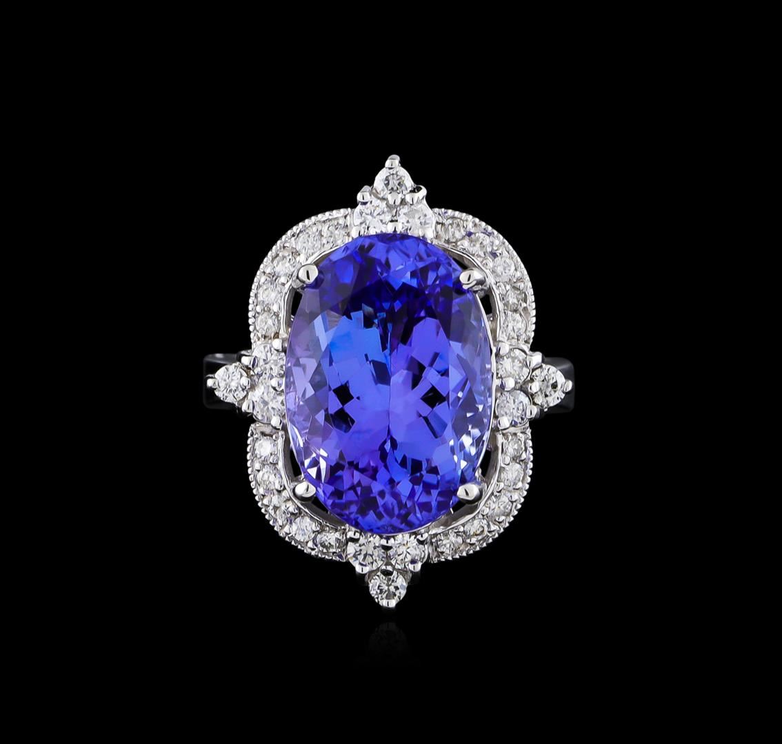 One electronically tested 14KT white gold ladies cast tanzanite and diamond ring. The featured tanzanite is set within a stylized diamond bezel supported by a ribbed under gallery, completed by a three millimeter wide band. Bright polish finish with milgrain detailing. Identified with markings of "K14". Condition is new, good workmanship. Containing: One prong set oval mixed cut natural tanzanite, measuring 15.70 x 10.80 x 8.20mm, approximate weight of 9.78ct., clarity is eye clean, type I, medium dark, very slightly grayish, bluish violet color, (GIA bV 6/3), cut is good. Transmitting light with no distortion, transparent. Colored Stone Grading Report attached. Graded in the setting. Tanzanite is a very rare gemstone that is only found in the country of Tanzania. Originally discovered in 1967. Tiffany & Company, named the stone Tanzanite. It is found in the Usumburu Mountains that border the Umba Valley of northern Tanzania. Tanzanite occurs in gray, brown, violet, blue, reddish-purple, & green. The gem is interesting because of its exceptional pleochroism. Rotated in different directions a tanzanite will exhibit multiple changes of color. Tanzanite has a low tolerance to ultrasonic cleaning, and should not be cleaned using this method. Twelve prong set round brilliant cut diamonds, measuring 2.00 - 1.90 x 1.17mm (depth est.) approximate total weight of 12 Stones = 0.33ct. Graded in the setting. Clarity: SI-2 to I-2. Color: G - H Twenty prong set round brilliant cut diamonds, measuring 1.30 - 1.25 x 0.77mm (depth est.) approximate total weight of 20 Stones = 0.15ct. Graded in the setting. Clarity: SI-2 to I-2. Color: G - I. Total Weight of Colored Stones 9.78ct. Total Weight of Diamonds 0.48ct. Total Weight of Ring 9.74gm. AIG Appraised at $23,755.00.