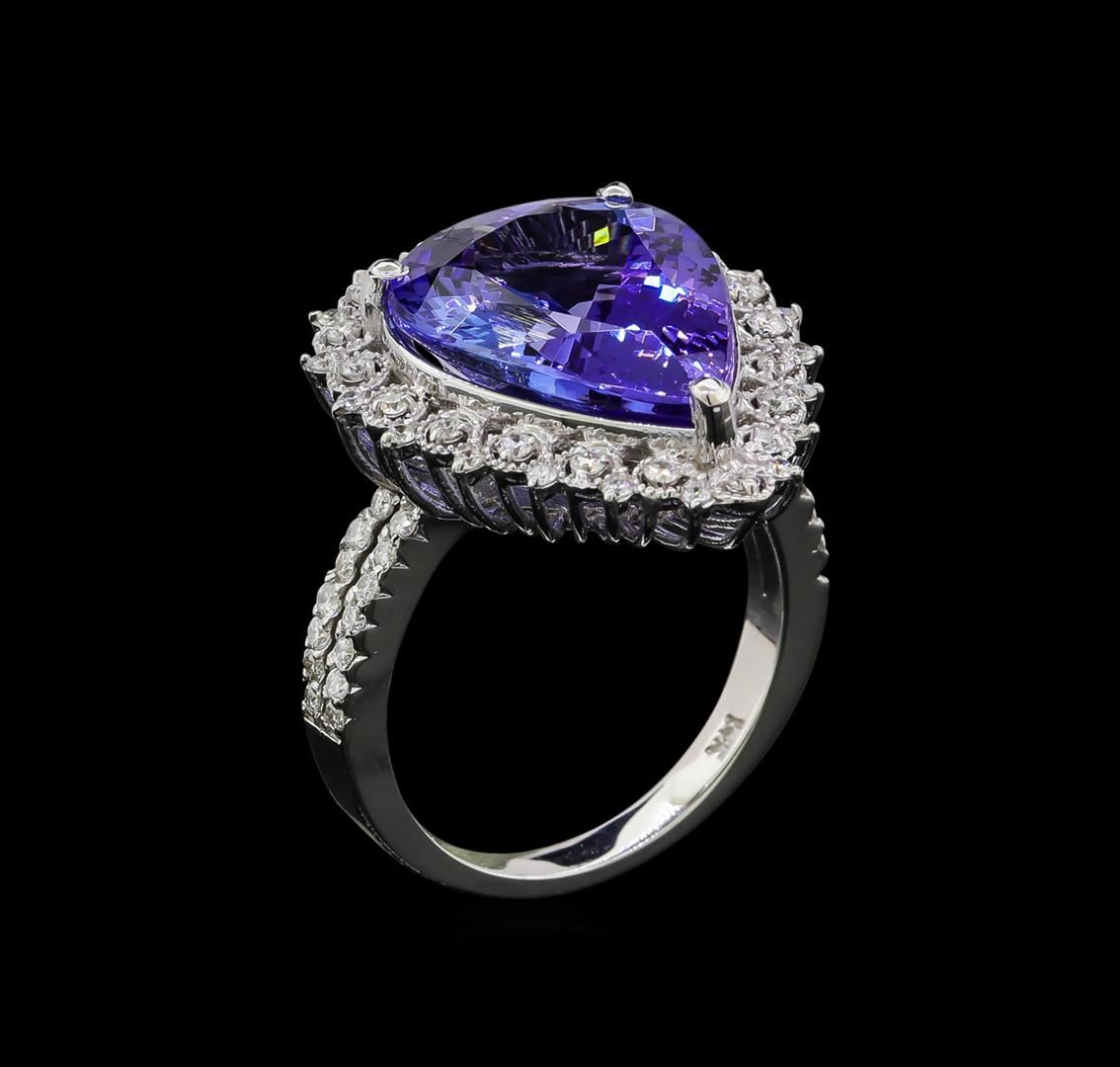 One electronically tested 14KT white gold lady's cast fashion ring with a split shank double basket halo with a bright polish with milgrain detailing finish. The featured lady's ring has a shank measuring 2.23 millimeters wide. Identified with markings of '14K'. Condition is new, good workmanship. Containing: One prong set pear modified brilliant cut natural tanzanite, measuring 16.95 x 12.13 x 7.28mm, (depth est.) approximate weight of 9.78ct., clarity is eye clean, medium, moderately strong, violetish blue color, (GIA vB 5/4), cut is very good. Transmitting light with no distortion, transparent. Colored gemstones are presumed to have been subjected to commonly used enhancement processes. Graded in the setting. Nineteen prong set round brilliant cut diamonds, measuring 1.60 - 1.50 x 0.96mm (depth est.) approximate total weight of 19 Stones = 0.27ct. Graded in the setting. Clarity SI-1 to I-1. Color: H - I Cut Good Twenty-Eight prong set round brilliant cut diamonds, measuring 1.35 - 1.25 x 0.81mm (depth est.) approximate total weight of 28 Stones = 0.24ct. Graded in the setting. Clarity SI-1 to I-1. Color: H - I Cut Good Nineteen prong set round brilliant cut diamonds, measuring 1.25 - 1.15 x 0.72mm (depth est.) approximate total weight of 19 Stones = 0.12ct. Graded in the setting. Clarity SI-1 to I-1. Color: H - I Cut Good. Total Weight of Colored Stones 9.78ct.. Total Weight of Diamonds 0.63ct.. Total Weight of Ring 7.90gm GAS Appraised at $18,435.00.