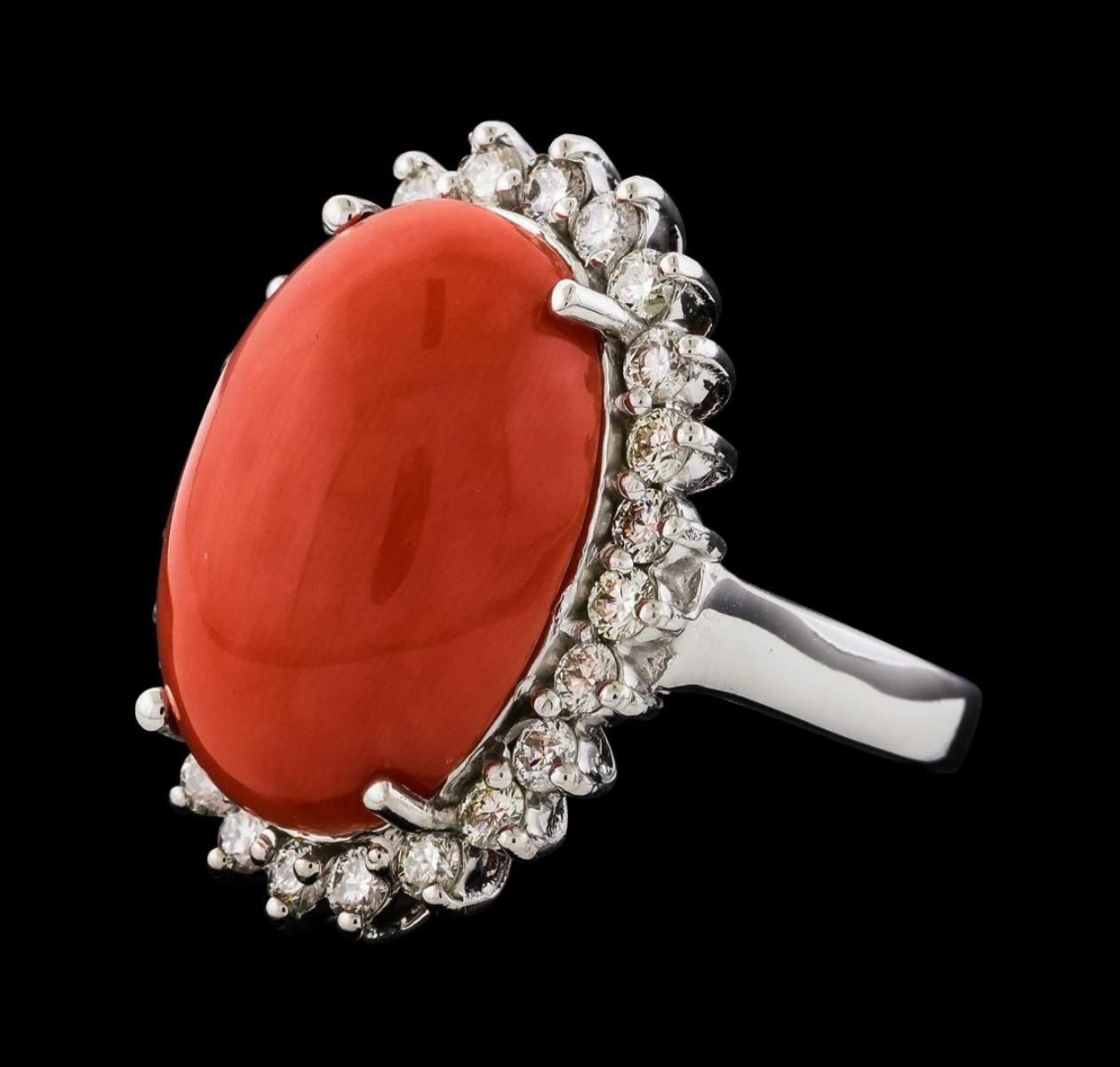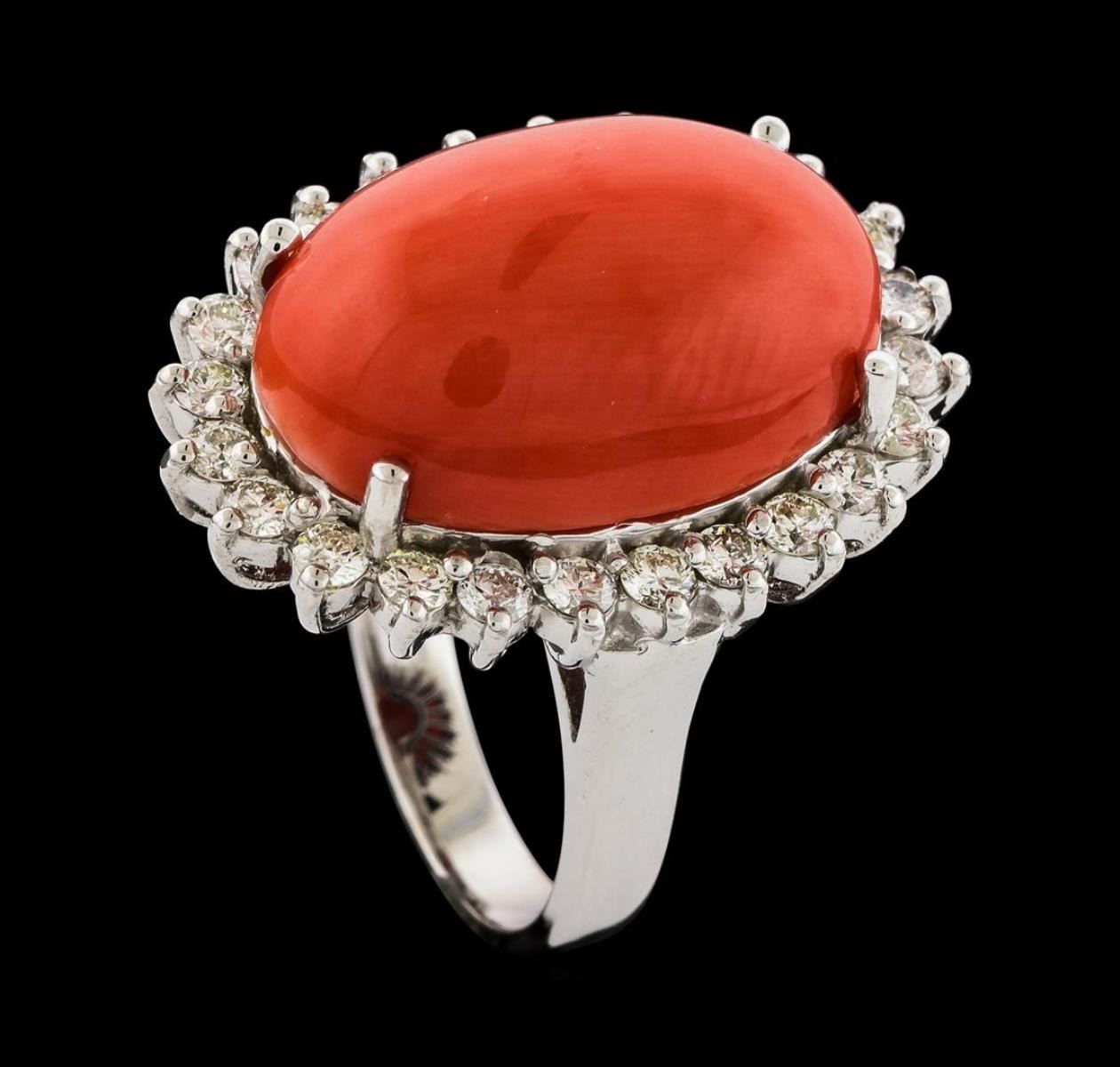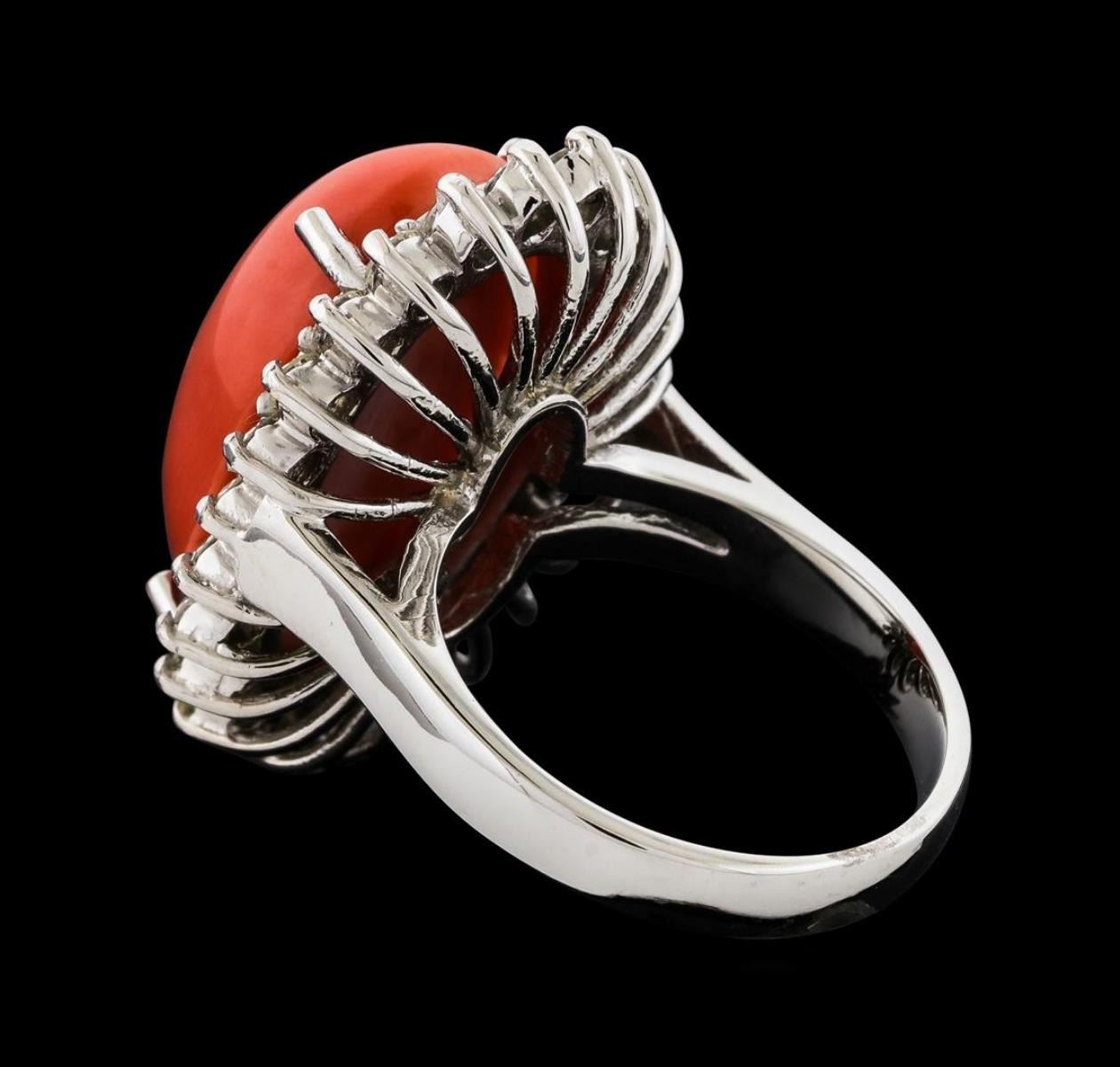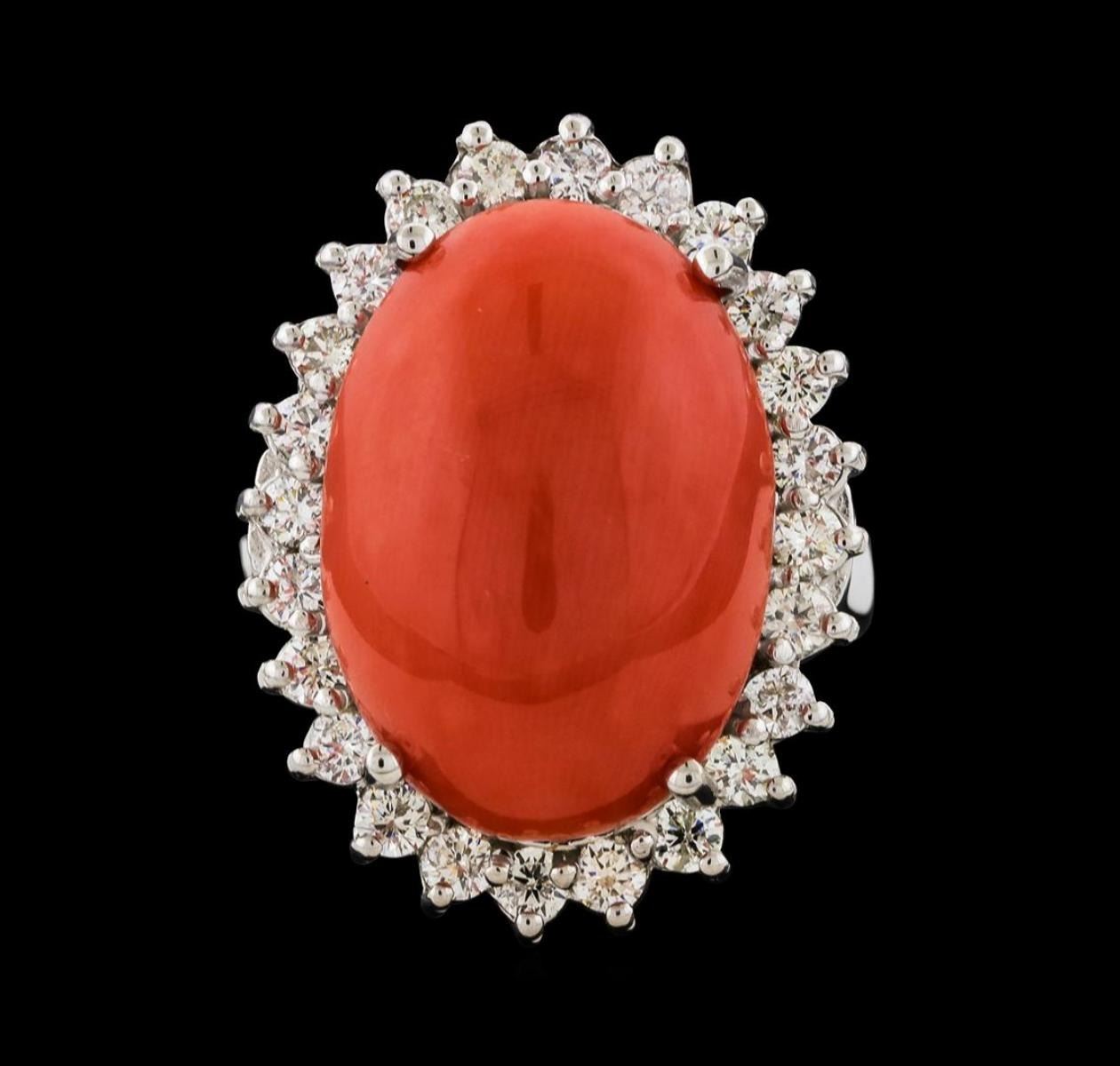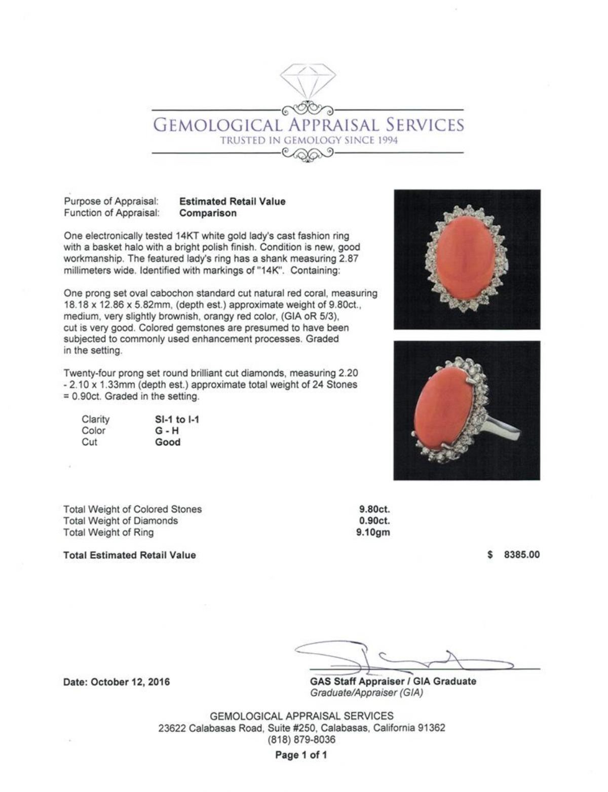 One electronically tested 14KT white gold lady's cast fashion ring with a basket halo with a bright polish finish. The featured lady's ring has a shank measuring 2.87 millimeters wide. Identified with markings of '14K'. Condition is new, good workmanship. Containing: One prong set oval cabochon standard cut natural red coral, measuring 18.18 x 12.86 x 5.82mm, (depth est.) approximate weight of 9.80ct., medium, very slightly brownish, orangey red color, (GIA oR 5/3), cut is very good. Colored gemstones are presumed to have been subjected to commonly used enhancement processes. Graded in the setting. Twenty-Four prong set round brilliant cut diamonds, measuring 2.20 - 2.10 x 1.33mm (depth est.) approximate total weight of 24 Stones = 0.90ct. Graded in the setting. Clarity SI-1 to I-1. Color: G - H Cut Good. Total Weight of Colored Stones 9.80ct.. Total Weight of Diamonds 0.90ct.. Total Weight of Ring 9.10gm. GAS Appraised.