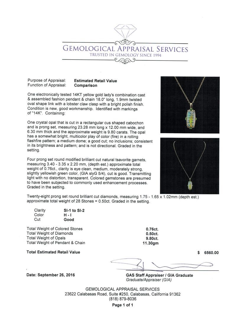 One electronically tested 14KT yellow gold lady's combination cast & assembled fashion pendant & chain 18.0' long, 1.9mm twisted oval shape link with a lobster claw clasp with a bright polish finish. Identified with markings of '14K'. Condition is new, good workmanship. Containing: One crystal opal that is cut in a rectangular cus shaped cabochon and is prong set, measuring 23.28 mm long x 12.00 mm wide, and 6.30 mm thick and the approximate weight is 9.80 carats. The opal has a somewhat bright, multicolor play of color (fire) in a rolling flashfire pattern; a medium dome; a good cut; no inclusions; consistent in its brightness and pattern; and is not directional. Graded in the setting. Four prong set round modified brilliant cut natural tsavorite garnets, measuring 3.40 - 3.35 x 2.20 mm, (depth est.) approximate total weight of 0.76ct., clarity is eye clean, medium, moderately strong, slightly yellowish green color, (GIA slyG 5/4), cut is good. Transmitting light with no distortion, transparent. Colored gemstones are presumed to have been subjected to commonly used enhancement processes. Graded in the setting. Twenty-Eight prong set round brilliant cut diamonds, measuring 1.75 - 1.65 x 1.02mm (depth est.) approximate total weight of 28 Stones = 0.50ct. Graded in the setting. Clarity SI-1 to SI-2. Color: H - I Cut Good. Total Weight of Colored Stones 0.76ct.. Total Weight of Diamonds 0.50ct.. Total Weight of Opals 9.80ct.. Total Weight of Pendant & Chain 11.30gm. GAS Appraised at $6,560.00.