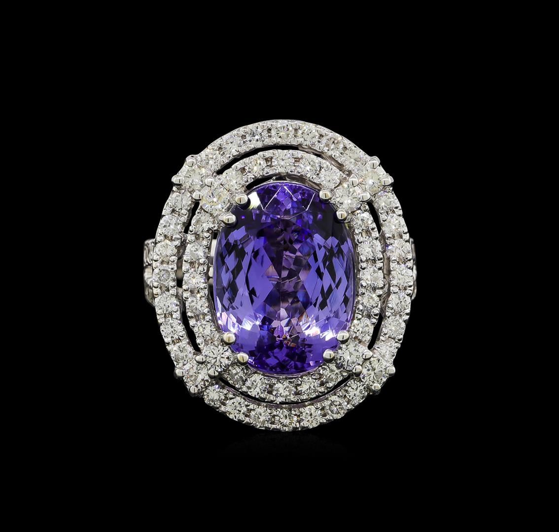 One electronically tested 14KT white gold lady's combination cast & assembled fashion ring with a split shank double halo with a bright polish finish. The featured lady's ring has a shank measuring 3.88 millimeters wide. Identified with markings of 'K14'. Condition is new, good workmanship. Containing: One prong set oval modified brilliant cut natural tanzanite, measuring 14.51 x 10.70 x 7.40mm, (depth est.) 20%. bulge factor, approximate weight of 9.81ct., clarity is eye clean, medium, moderately strong, violet color, (GIA V 5/4), cut is very good. Transmitting light with no distortion, transparent. Colored gemstones are presumed to have been subjected to commonly used enhancement processes. Graded in the setting. Eight prong set round brilliant cut diamonds, measuring 2.25 - 2.15 x 1.34mm (depth est.) approximate total weight of 8 Stones = 0.32ct. Graded in the setting. Clarity SI-1 to SI-2. Color: H - I Cut Good Sixty-Eight prong set round brilliant cut diamonds, measuring 1.80 - 1.70 x 1.07mm (depth est.) approximate total weight of 68 Stones = 1.36ct. Graded in the setting. Clarity SI-1 to I-1. Color: H - I Cut Good. Total Weight of Colored Stones 9.81ct.. Total Weight of Diamonds 1.68ct.. Total Weight of Ring 13.00gm GAS Appraised at $20,670.00.