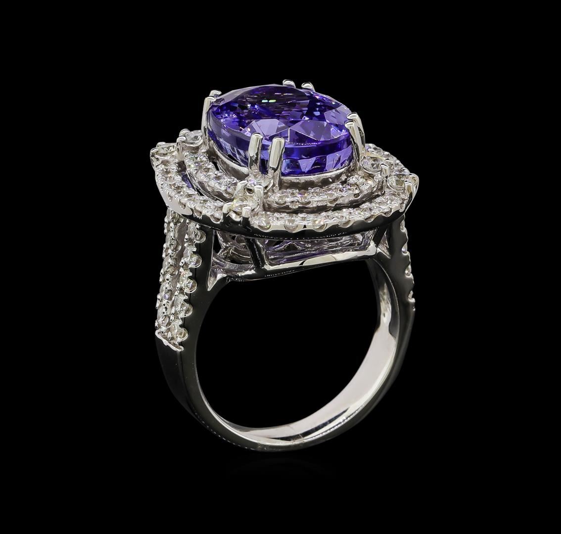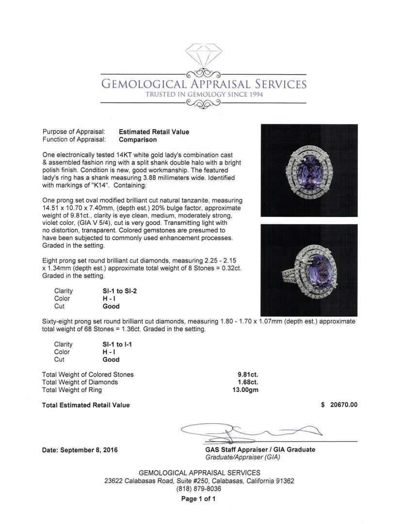 One electronically tested 14KT white gold lady's combination cast & assembled fashion ring with a split shank double halo with a bright polish finish. The featured lady's ring has a shank measuring 3.88 millimeters wide. Identified with markings of 'K14'. Condition is new, good workmanship. Containing: One prong set oval modified brilliant cut natural tanzanite, measuring 14.51 x 10.70 x 7.40mm, (depth est.) 20%. bulge factor, approximate weight of 9.81ct., clarity is eye clean, medium, moderately strong, violet color, (GIA V 5/4), cut is very good. Transmitting light with no distortion, transparent. Colored gemstones are presumed to have been subjected to commonly used enhancement processes. Graded in the setting. Eight prong set round brilliant cut diamonds, measuring 2.25 - 2.15 x 1.34mm (depth est.) approximate total weight of 8 Stones = 0.32ct. Graded in the setting. Clarity SI-1 to SI-2. Color: H - I Cut Good Sixty-Eight prong set round brilliant cut diamonds, measuring 1.80 - 1.70 x 1.07mm (depth est.) approximate total weight of 68 Stones = 1.36ct. Graded in the setting. Clarity SI-1 to I-1. Color: H - I Cut Good. Total Weight of Colored Stones 9.81ct.. Total Weight of Diamonds 1.68ct.. Total Weight of Ring 13.00gm GAS Appraised at $20,670.00.