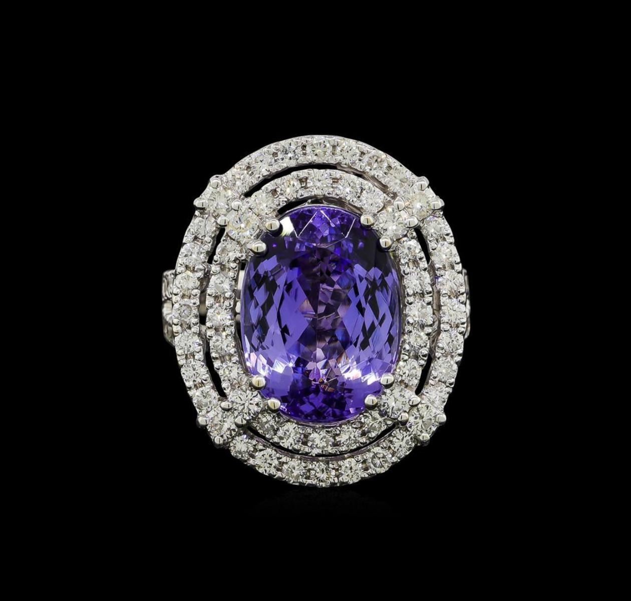One electronically tested 14KT white gold lady's combination cast & assembled fashion ring with a split shank double halo with a bright polish finish. The featured lady's ring has a shank measuring 3.88 millimeters wide. Identified with markings of 'K14'. Condition is new, good workmanship. Containing: One prong set oval modified brilliant cut natural tanzanite, measuring 14.51 x 10.70 x 7.40mm, (depth est.) 20%. bulge factor, approximate weight of 9.81ct., clarity is eye clean, medium, moderately strong, violet color, (GIA V 5/4), cut is very good. Transmitting light with no distortion, transparent. Colored gemstones are presumed to have been subjected to commonly used enhancement processes. Graded in the setting. Eight prong set round brilliant cut diamonds, measuring 2.25 - 2.15 x 1.34mm (depth est.) approximate total weight of 8 Stones = 0.32ct. Graded in the setting. Clarity SI-1 to SI-2. Color: H - I Cut Good Sixty-Eight prong set round brilliant cut diamonds, measuring 1.80 - 1.70 x 1.07mm (depth est.) approximate total weight of 68 Stones = 1.36ct. Graded in the setting. Clarity SI-1 to I-1. Color: H - I Cut Good. Total Weight of Colored Stones 9.81ct.. Total Weight of Diamonds 1.68ct.. Total Weight of Ring 13.00gm GAS Appraised.