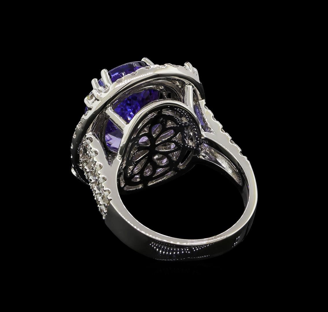 One electronically tested 14KT white gold lady's combination cast & assembled fashion ring with a split shank double halo with a bright polish finish. The featured lady's ring has a shank measuring 3.88 millimeters wide. Identified with markings of 'K14'. Condition is new, good workmanship. Containing: One prong set oval modified brilliant cut natural tanzanite, measuring 14.51 x 10.70 x 7.40mm, (depth est.) 20%. bulge factor, approximate weight of 9.81ct., clarity is eye clean, medium, moderately strong, violet color, (GIA V 5/4), cut is very good. Transmitting light with no distortion, transparent. Colored gemstones are presumed to have been subjected to commonly used enhancement processes. Graded in the setting. Eight prong set round brilliant cut diamonds, measuring 2.25 - 2.15 x 1.34mm (depth est.) approximate total weight of 8 Stones = 0.32ct. Graded in the setting. Clarity SI-1 to SI-2. Color: H - I Cut Good Sixty-Eight prong set round brilliant cut diamonds, measuring 1.80 - 1.70 x 1.07mm (depth est.) approximate total weight of 68 Stones = 1.36ct. Graded in the setting. Clarity SI-1 to I-1. Color: H - I Cut Good. Total Weight of Colored Stones 9.81ct.. Total Weight of Diamonds 1.68ct.. Total Weight of Ring 13.00gm GAS Appraised.