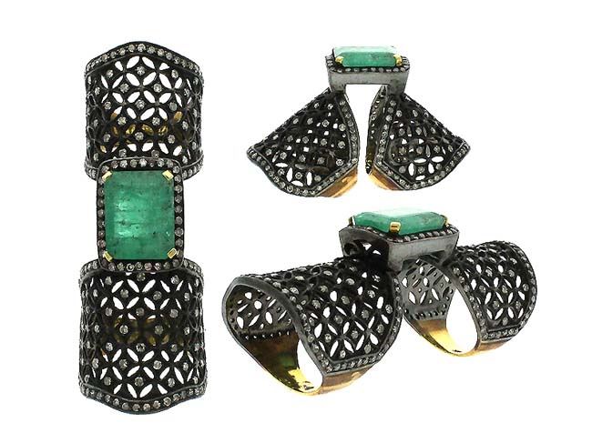 EMERALD AND DIAMOND KNUCKLE RING/Diamond Count 1:/Diamond Total Carat :2.52/Diamond Color & Clarity:J-L/I1-I2 Single Cut /Diamond Count 2:/Diamond 2 CTW:/Diamond Count 3:/Gemstone Count 1:/Gemstone CTW:7.3/Gemstone Dimension:/Gemstone Shape:Emerald Cut- Emerald /Gemstone Count 2:/Gemstone CTW:/Gemstone Shape:/Ring Dimension:/Metal Type 1:18kYellow Gold :Gram Weight:4.43/Metal Type 2:over0.925Sterling Silver / Weight Gram:11.77/Gross Weight :18.16/Ring Size:7.5