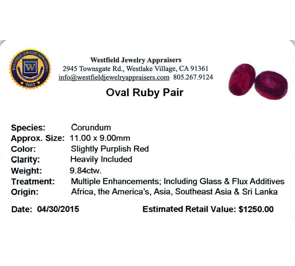 Two oval mixed cut natural rubies exact total weight 9.84ct., clarity is heavily included, type II, dark, very slightly brownish, slightly purplish red color, (GIA slpR 7/3), cut is good. Westfield Appraised at $1,250.00.
