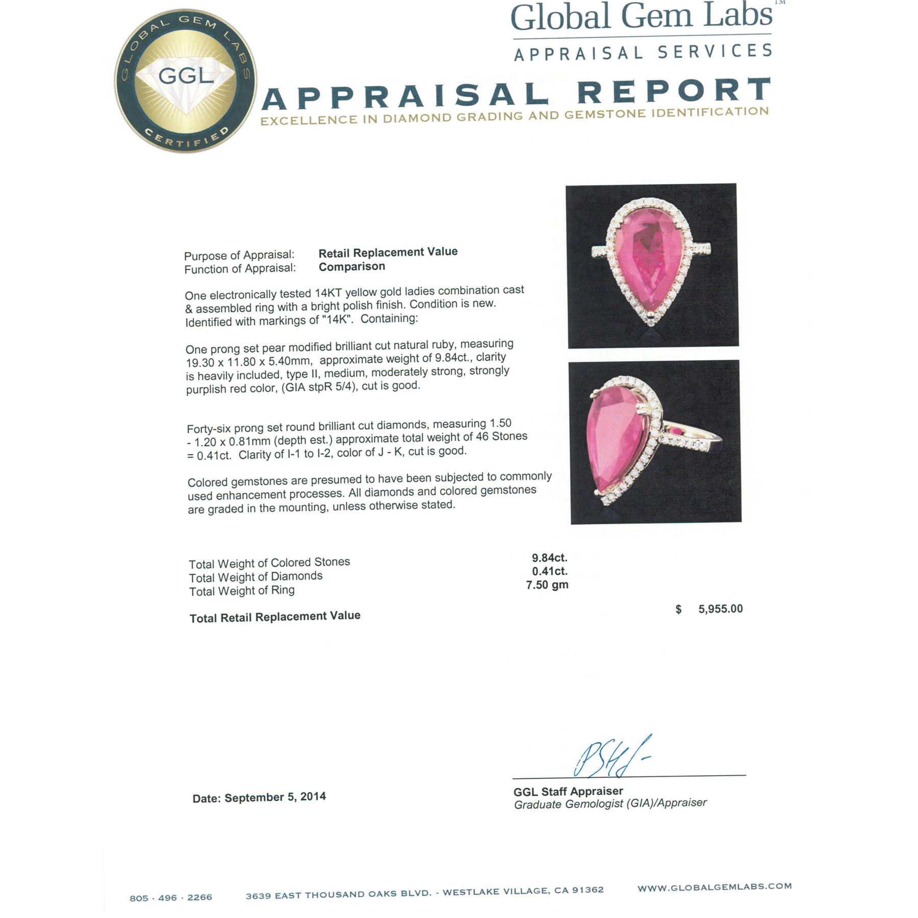 One electronically tested 14KT yellow gold ladies combination cast & assembled ring with a bright polish ?nish. Condition is new. Identi?ed with markings of "14K". Containing: One prong set pear modified brilliant cut natural ruby, measuring 19.30 x 11.80 x 5.40mm, approximate weight of 9.84ct., clarity is heavily included, type ll, medium, moderately strong, strongly purplish red color, (GlA stpR 5/4), cut is good. Forty-six prong set round brilliant cut diamonds, measuring 1.50 - 1.20 x 0.81mm (depth est.) approximate total weight of 46 Stones = 0.41ct. Clarity of I-1 to I-2, color of J - K, cut is good. Colored gemstones are presumed to have been subjected to commonly used enhancement processes. All diamonds and colored gemstones are graded in the mounting, unless otherwise stated. Total Weight of Colored Stones 9.84ct. Total Weight of Diamonds 0.41ct. Total Weight of Ring 7.50 gm Total Retail Replacement Value $ 5,955.00 GGL Appraised.