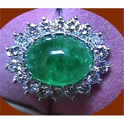 An Emerald And Diamond Ring; The large oval cabochon Colombia emerald, weighing approximately 9.84ct, prong set in a surround of 20 full-cut brilliant white diamonds, weighing approximately 2ct, mounted in 14K white gold, size 5.5.