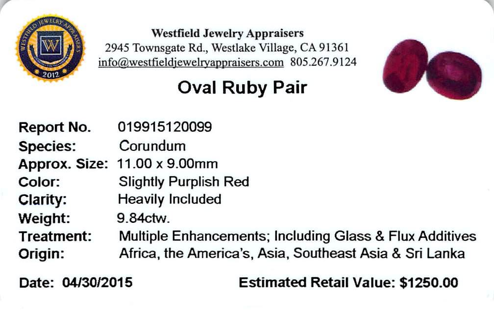 Two oval mixed cut natural rubies exact total weight 9.84ct., clarity is heavily included, type II, dark, very slightly brownish, slightly purplish red color, (GIA slpR 7/3), cut is good. Westfield Appraised at $1,250.00.