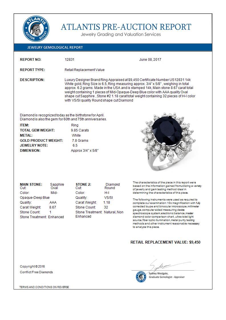 9.85 CTW Blue Sapphire & Diamond Ring 14K White Gold ---- Luxury Designer Brand Ring Appraised Retail Price at $9,450 ---- SKU Number US12831 14k White gold Ring Size is 6.5, Ring measuring approx. 3/4" x 5/8" , weighing in total approx. 6.2 grams. Made in the USA and is stamped 14k, Main stone 8.67 carat total weight containing 1 pieces of Mid-Opaque-Deep Blue color with AAA quality Oval shape cut Sapphire , Stone #2 1.18 carat total weight containing 32 pieces of H-I color with VS/SI quality Round shape cut