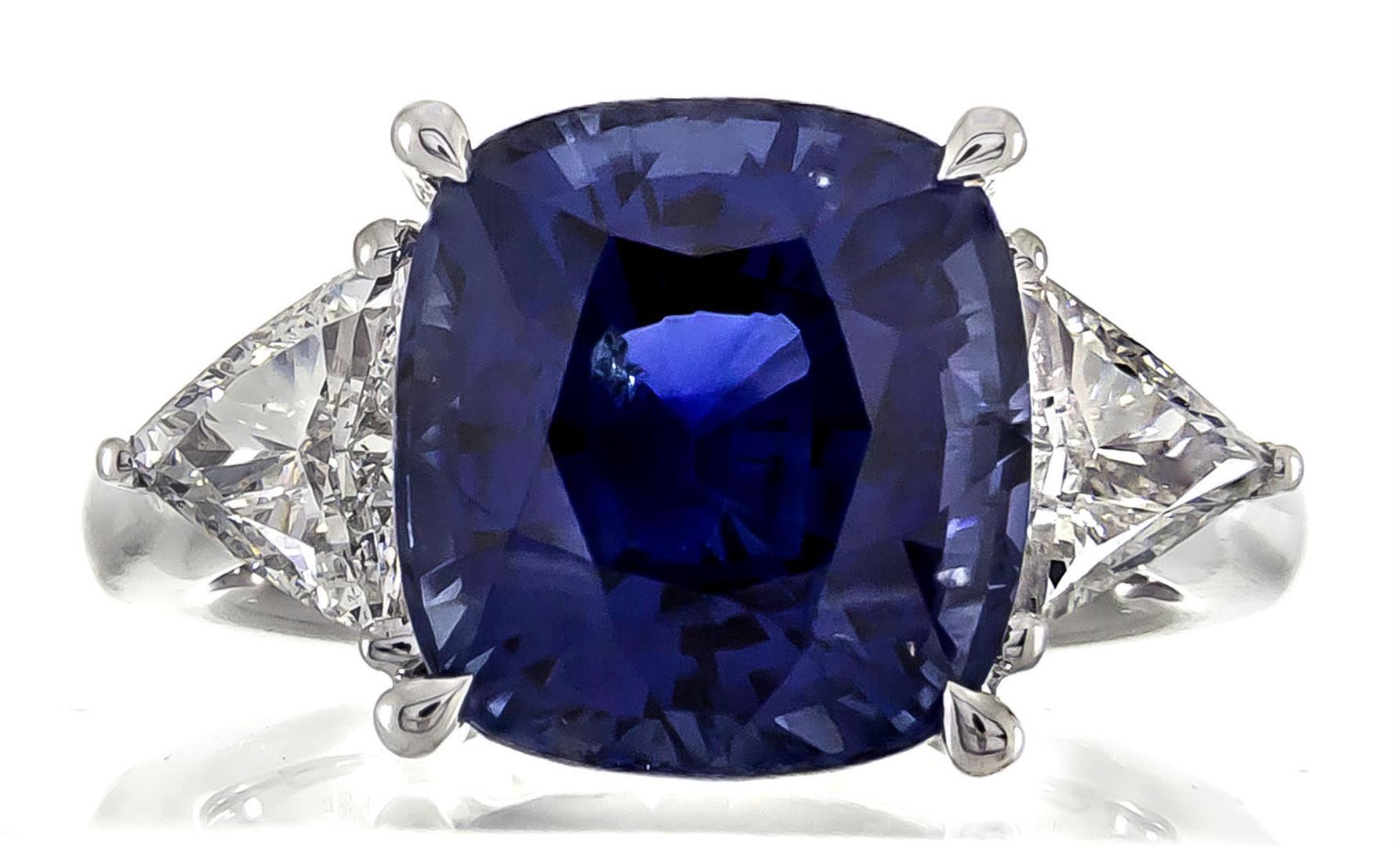 One ring featuring: 18KT White Gold weighing 7.92 grams containing one cushion cut Blue Sapphire with a total weight of 9.85 ct and diamonds weighing a total of 1.00 ctw. GRS Appraised.