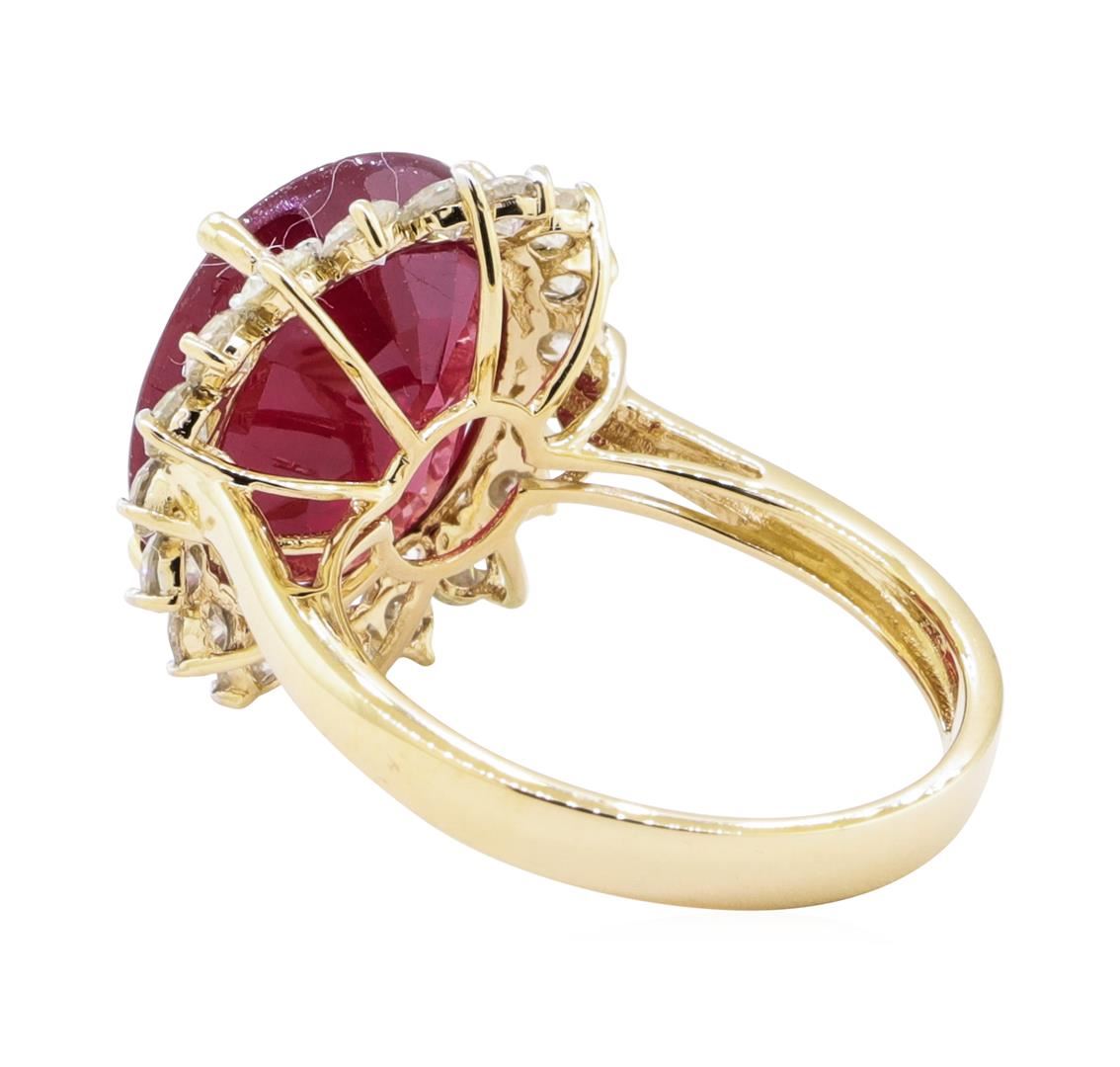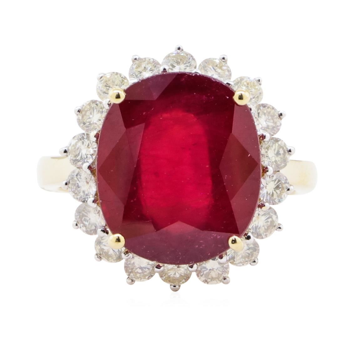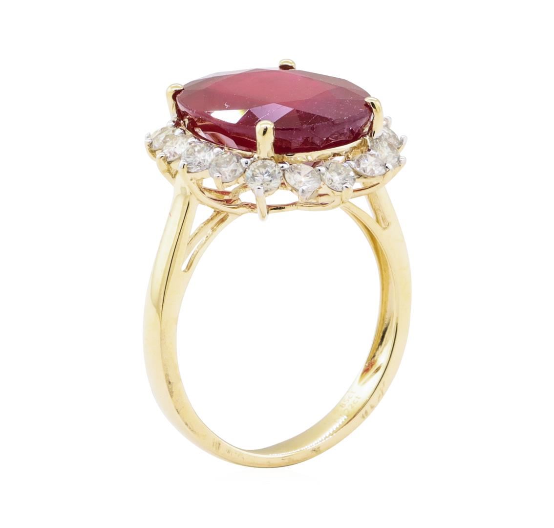 One electronically tested 14KT yellow gold ladies cast ruby and diamond ring. The featured ruby is set within a diamond floret supported by a ribbed under gallery, completed by a three millimeter wide band. Bright polish finish with rhodium accents. Trademark is Orianne. Identified with markings of "14K". Condition is new, excellent workmanship. Containing: One prong set oval mixed cut natural ruby, measuring 14.10 x 12.00 x 6.00mm, exact weight 9.85ct., clarity is heavily included, type II, medium dark, very slightly brownish, red color, (GIA R 6/3), cut is good. Transmitting light somewhat diffusely, transparent to translucent. Naturally occurring internal & external characteristics are present. Indications of laboratory high temperature heat treatment, with glass & flux additives. Graded in the setting. Ruby has a low tolerance to rhodium plating, repolishing the surface, & ultrasonic cleaning. Eighteen prong set round brilliant cut diamonds exact total weight 18 Stones = 1.22ct. Graded in the setting. Clarity SI-3 to I-2 Color G - I Total Weight of Colored Stones 9.85 ct. Total Weight of Diamonds 1.22 ct. Total Weight of Ring 5.40 gm Estimated Retail Value $ 3,930.00 US AIG Appraised.