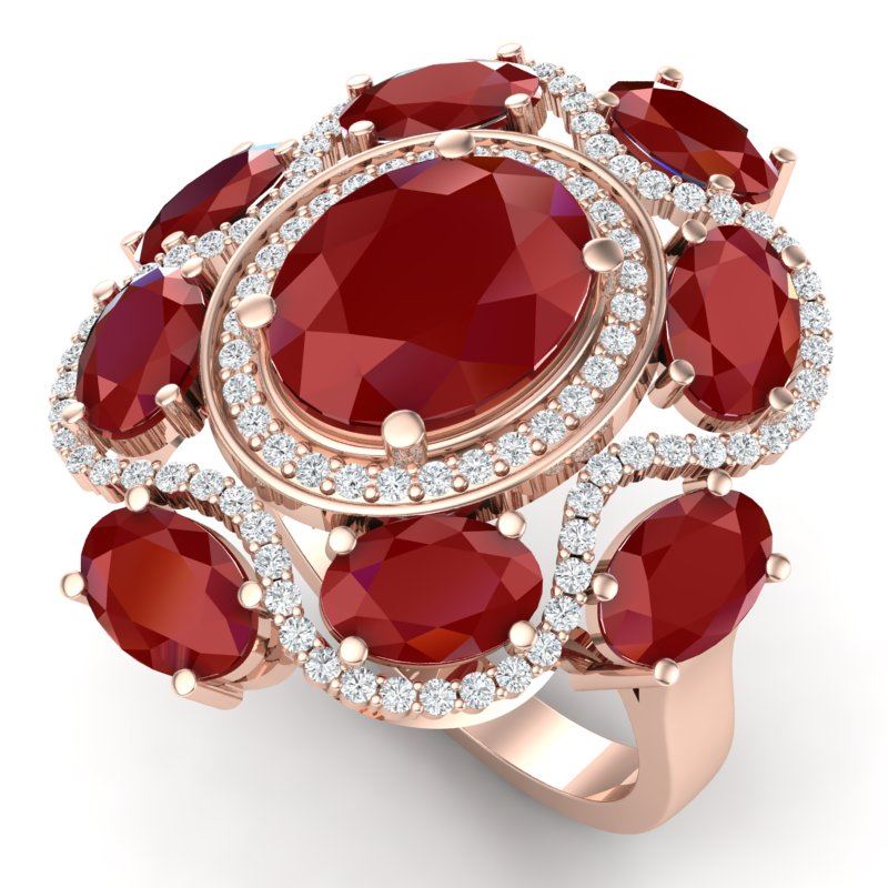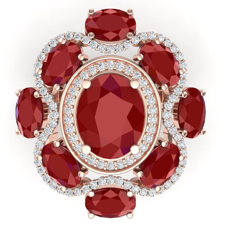 9.86 CTW Royalty Designer Ruby & VS Diamond Ring 18K Rose Gold ---- Luxury Designer Brand RIng Appraised Retail Price at $19,200 ---- SKU Number US39295 18K Rose gold RIng Size is 7, RIng measuring approx. 1 1/4 x 1 1/4 Inches, weighing in total approx. 14 grams. Made in the USA and is stamped 18K, Main stone 3.33 carat total weight containing 1 pieces of Intense Mid-Opaque Red color with AAA quality Oval shape cut Ruby , Stone #2 5.68 carat total weight containing 8 pieces of Intense Mid-Opaque Red color with AAA quality Oval shape cut